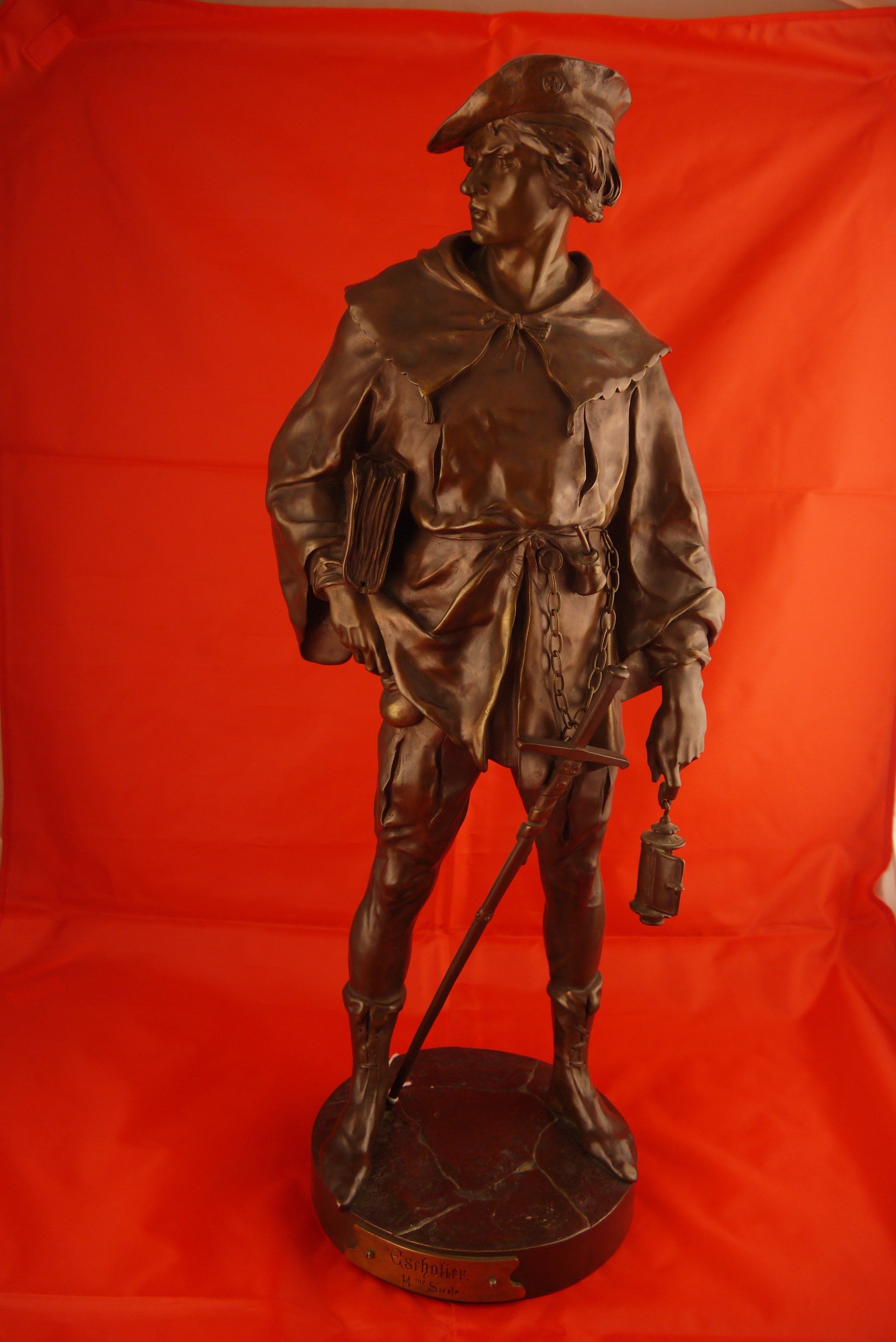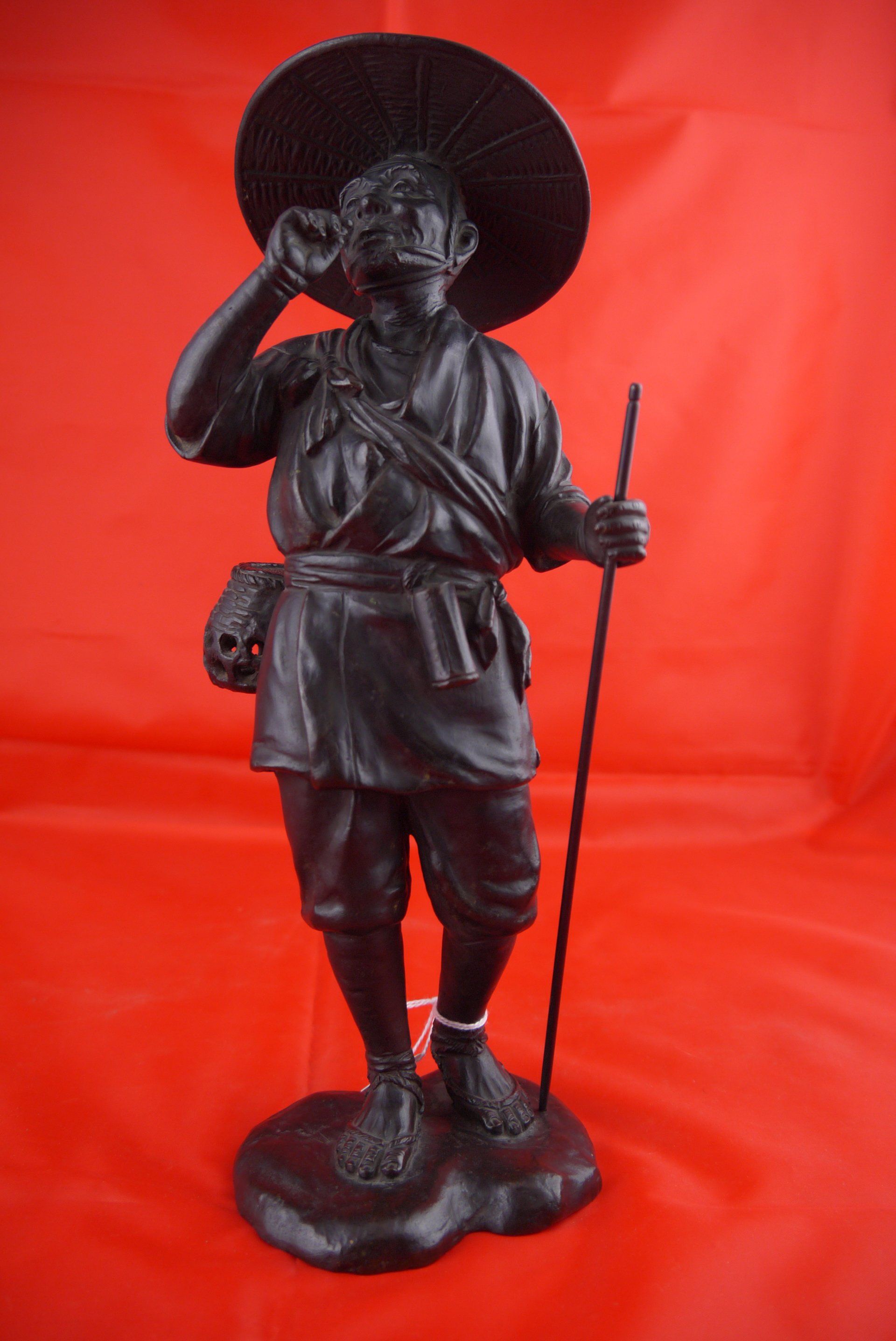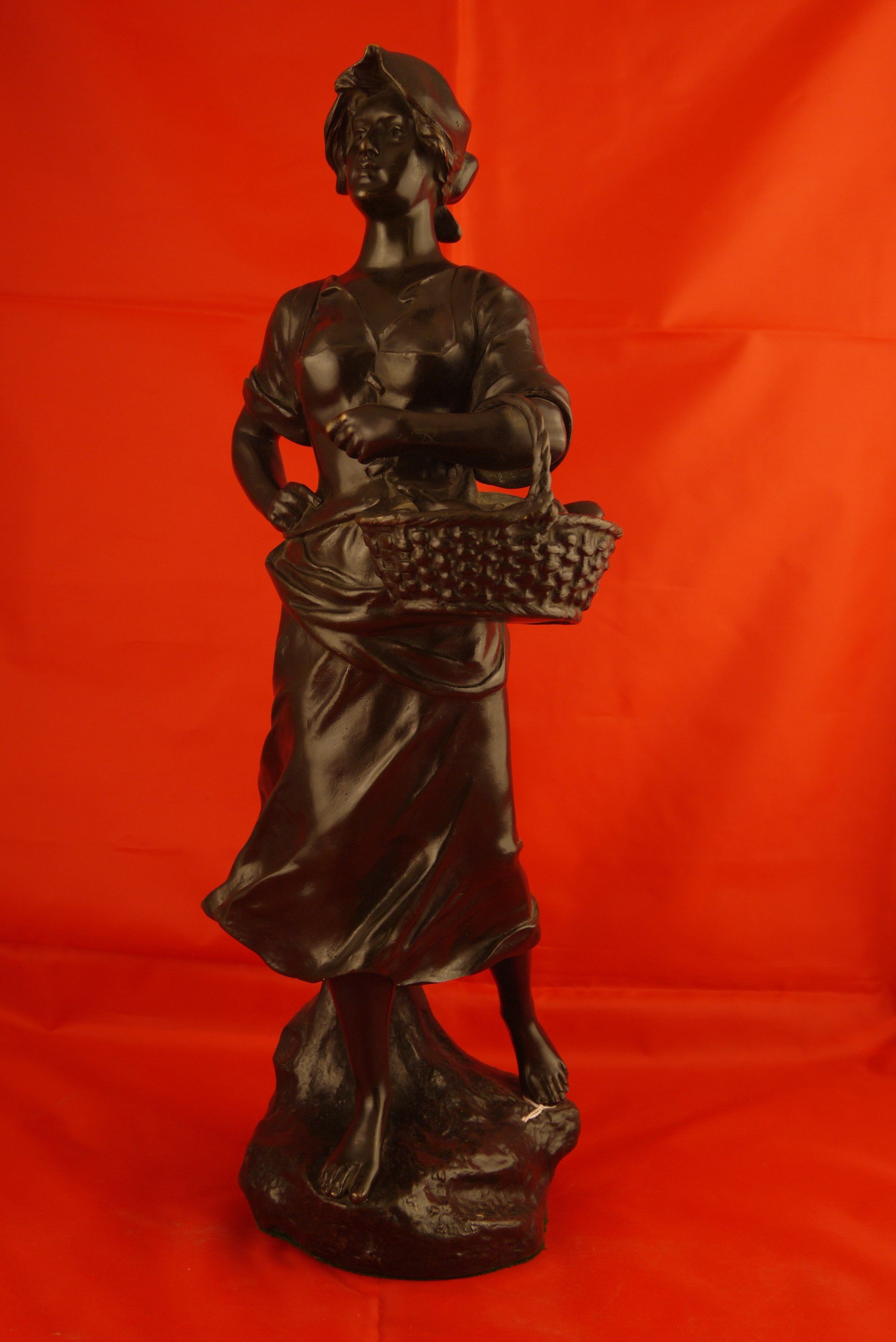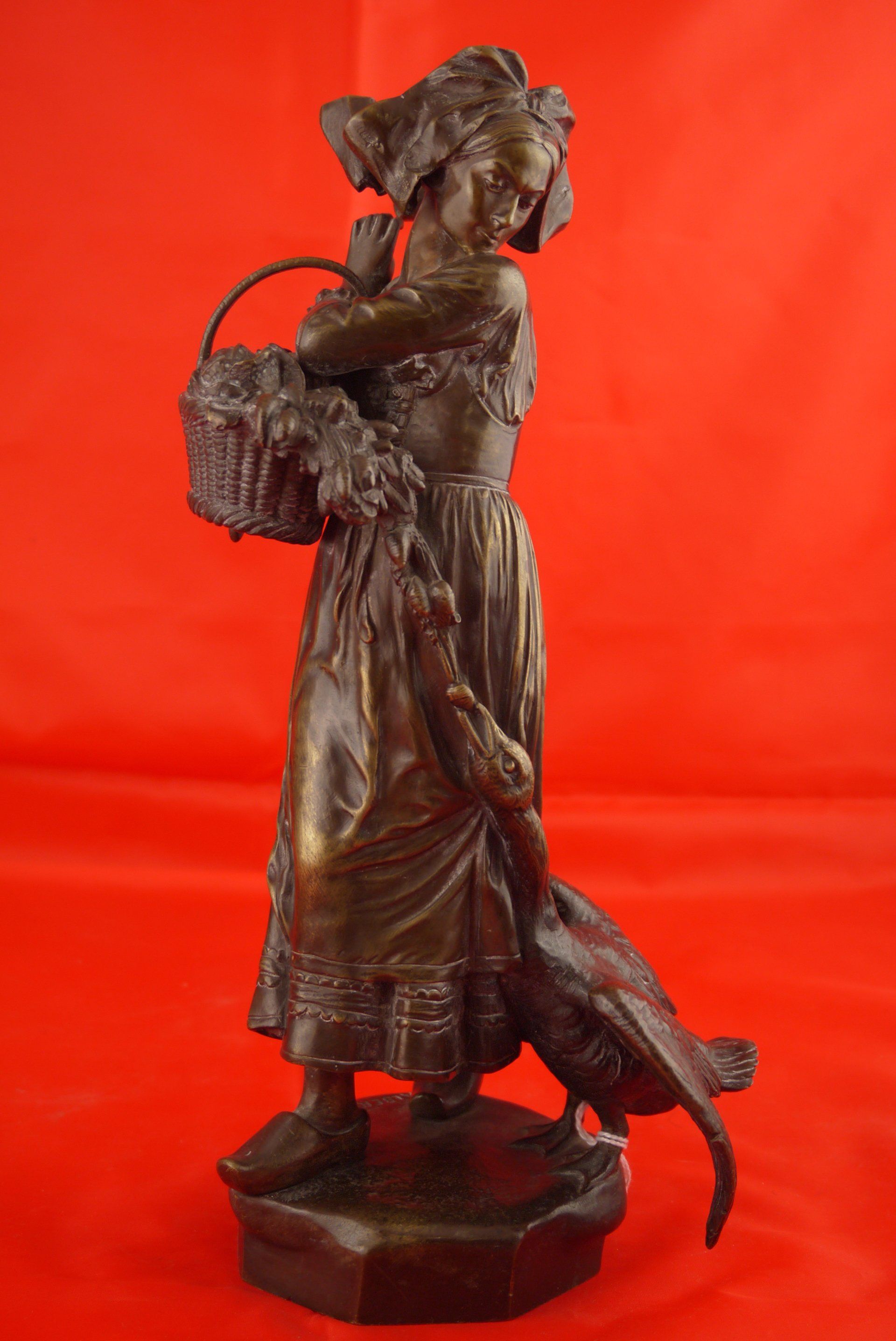 A Bronze, signed, circa 1910, of a young woman carrying a picnic basket, wearing a bonnet, blouse and skirt, bare feet on rocks. By Edouard Drouot (1859 – 1945). He studied in Paris under Emile Thomas and Matherin Moreau and worked as a genre painter and sculptor. He won a third class medal at the Salon of 1892 and an honourable mention at the Exposition Universelle of 1900. Size: 47cm tall.