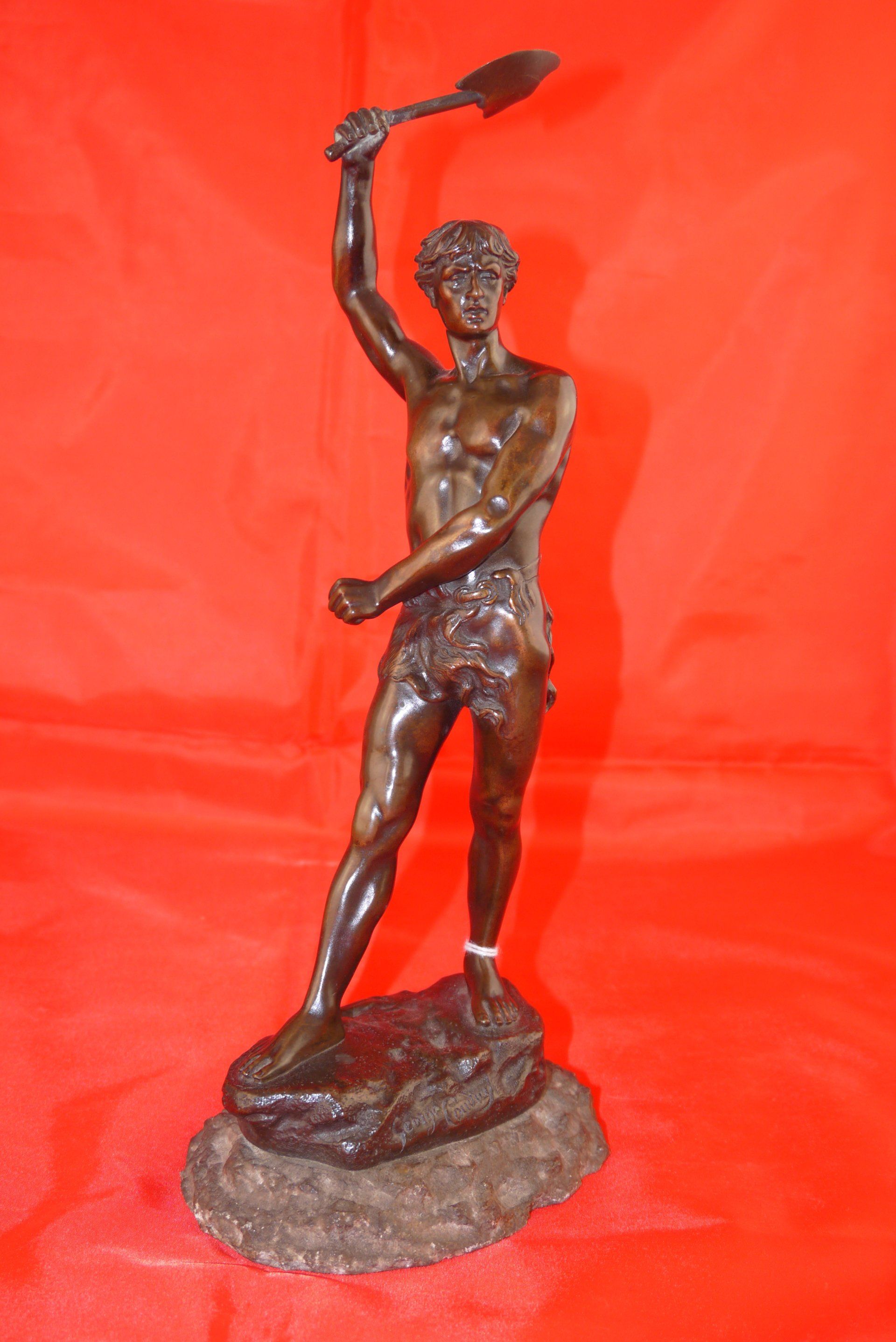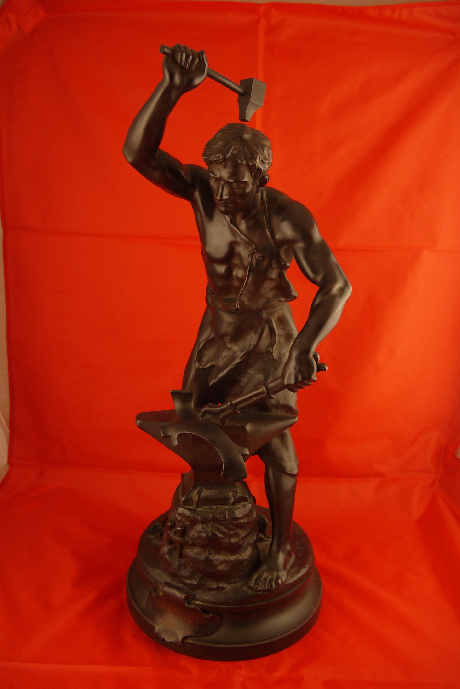 Adrien Etienne Gaudez (1845-1902) He was a pupil of François Jouffroy at the school of the Art schools of Paris in 1862, and debuted at the Paris Salon in 1864 winning a third class medal of that year and a first class medal in 1881. He went on to exhibit at the Salon on a regular basis. Bronze of a semi-clad figure of a blacksmith hammering at an anvil on naturalistic circular plinth base signed: A GAUDEZ, the moulded integral plinth inscribed FORGERON PAR a GAUDEZ HORS-CONCOURS. Size: 59.5cm high.