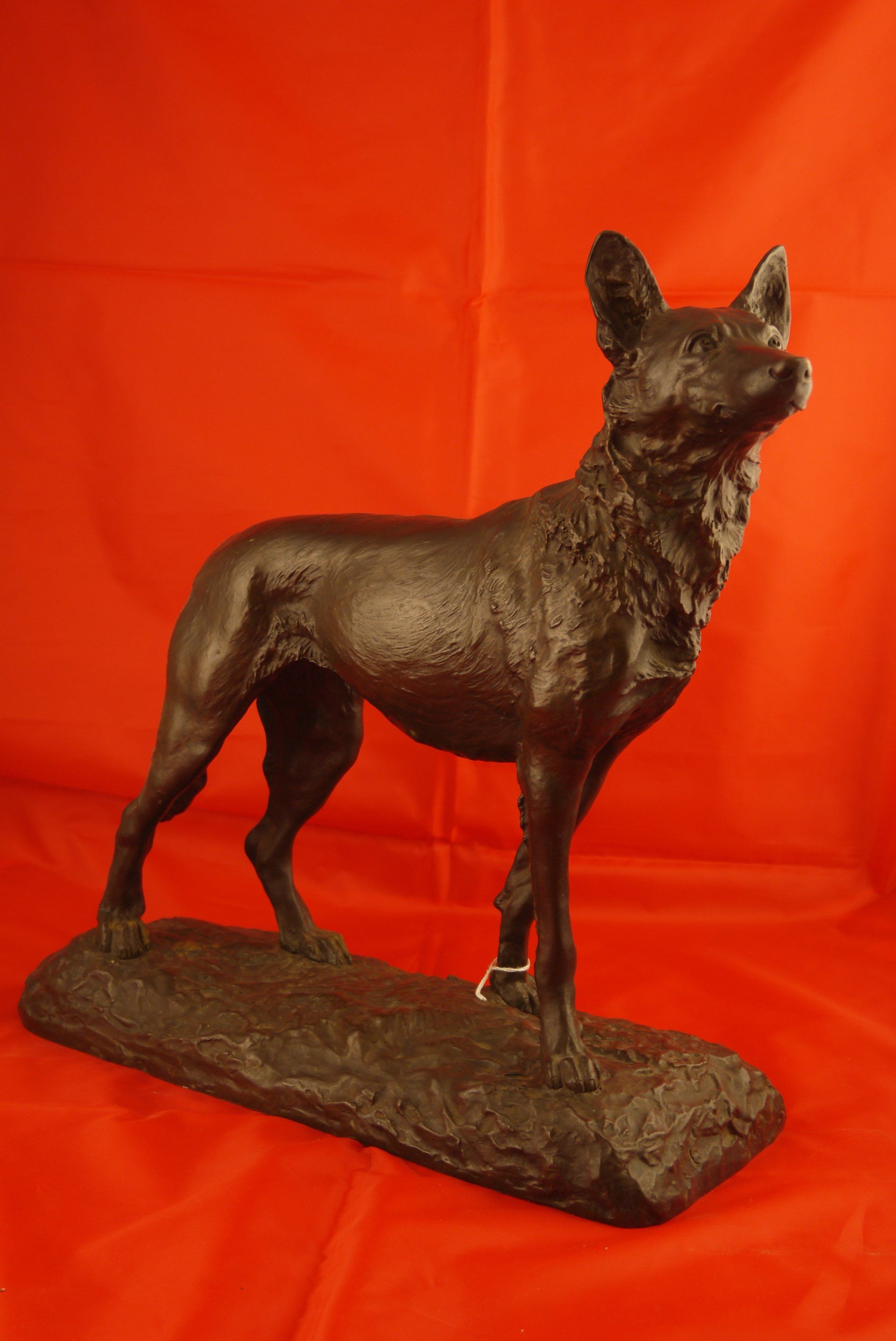 Belgian Shepherd or Belgian Malinois, bronze by René Paul Marquet,(1875-1937) was born in Port Louis and studied painting and sculpture under Emmanuel Fontaine and Jean Falguiere. He exhibited figures at the Salon des Artistes Français and gained an honourable mention in 1909. The bronze is signed with a foundry mark for the Societe des Bronzes de Paris and numbered. Size: 39.5cm tall.