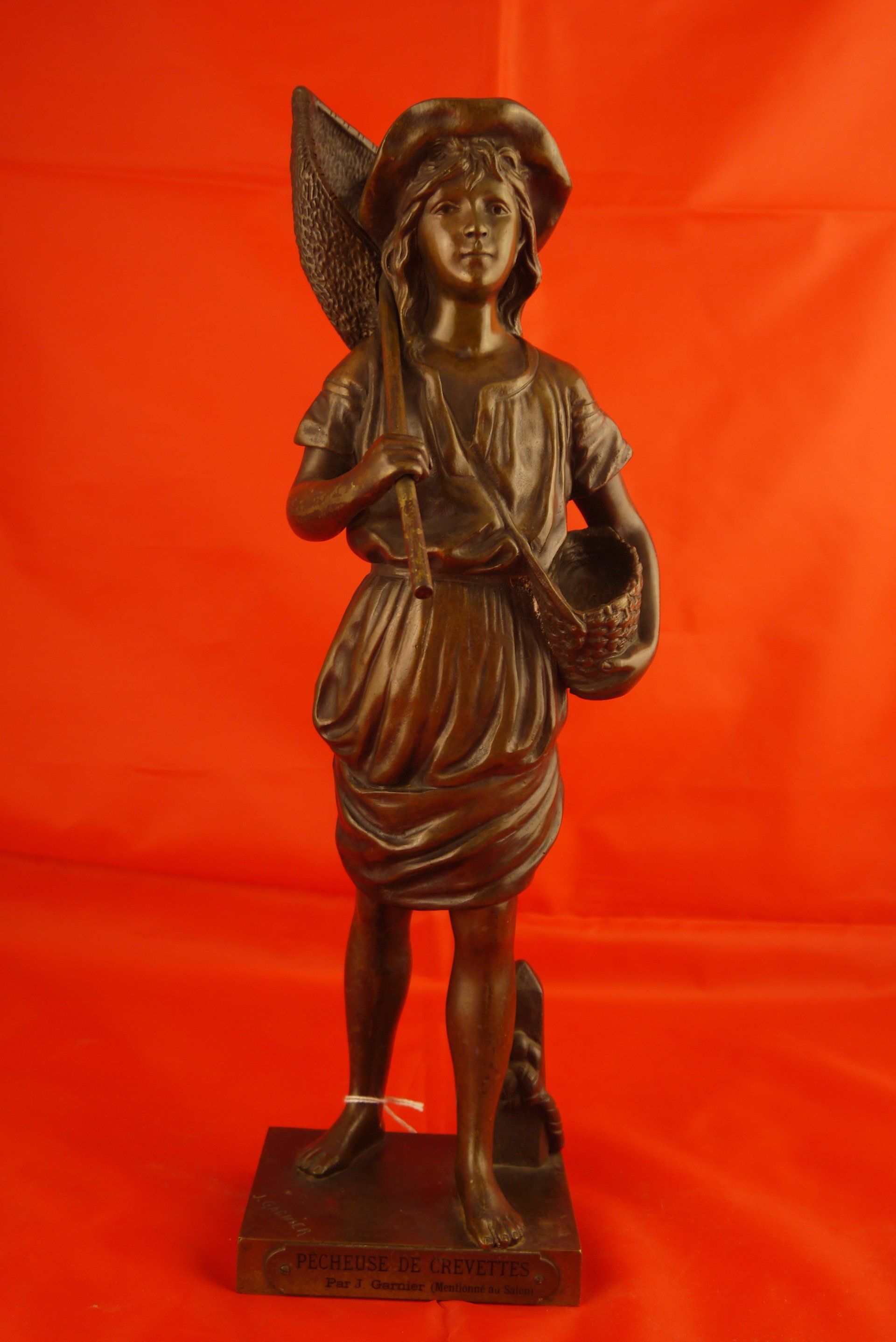 Jean Garnier (French, 1853-1910) exhibited regularly at the Paris Salon from 1883 to 1905, with works in different materials, particularly statuettes. He also produced vases, cups and bronze statues. Bronze of a Shrimp Fisherman, late 19th early 20th century, signed to base with Plaques on the base that read; ‘Pecheuse De Crevettes Par j. Garnier (Mentionne au Salon)’ and ‘Finnigans Paris’. Size: 40.5cm.