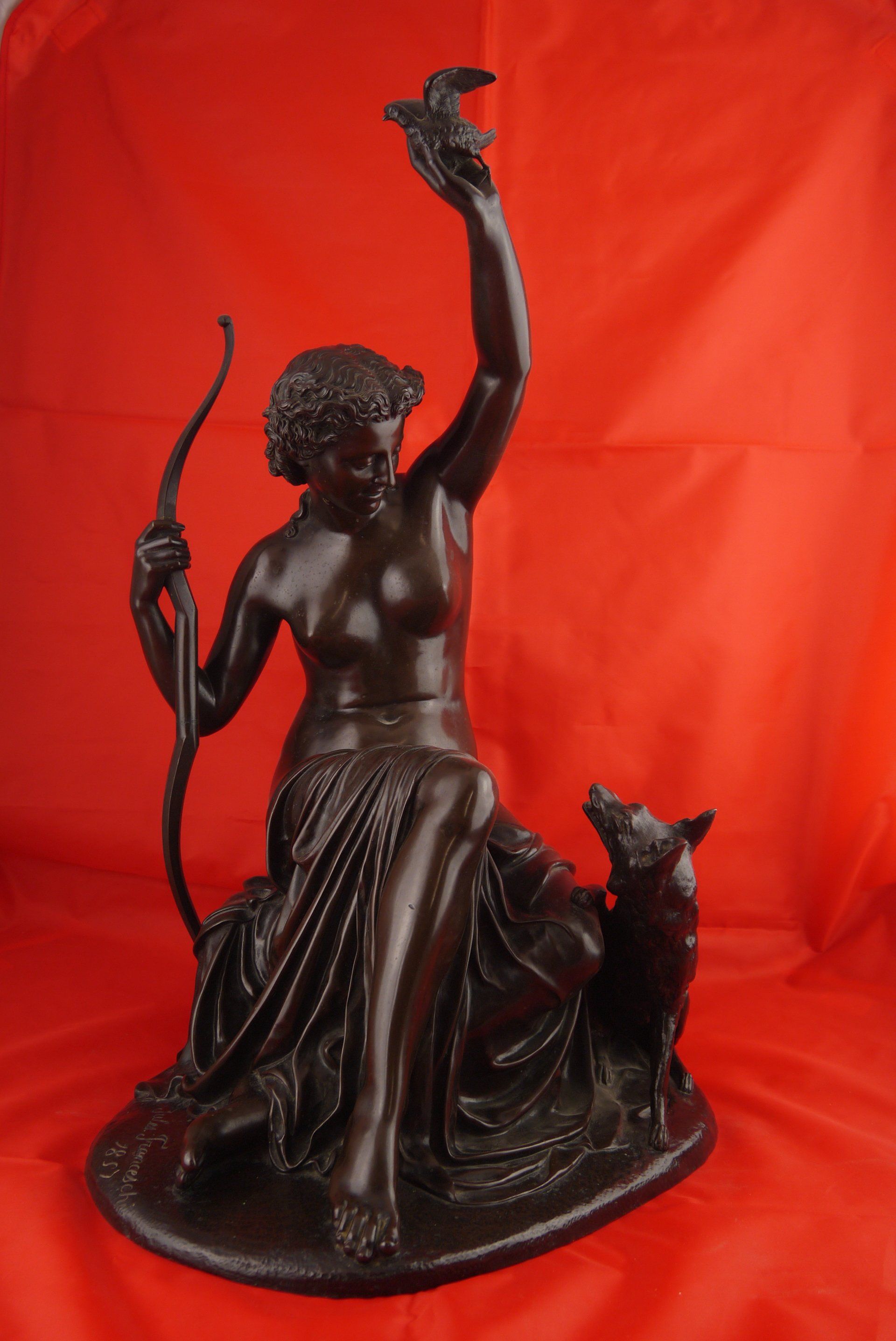 Louis-Julien Franceschi, (1825 – 1893) was a pupil of Francois Rude and exhibited at the Salon from 1849, winning medals in 1861 – 1869. He became Chevalier of the Legion of Honour in 1874. Bronze of the young Diana the Huntress Teasing a Fox by holding a bird out of reach, signed and dated: ‘Jules Franceschi 1857’. Size: 55cm tall.