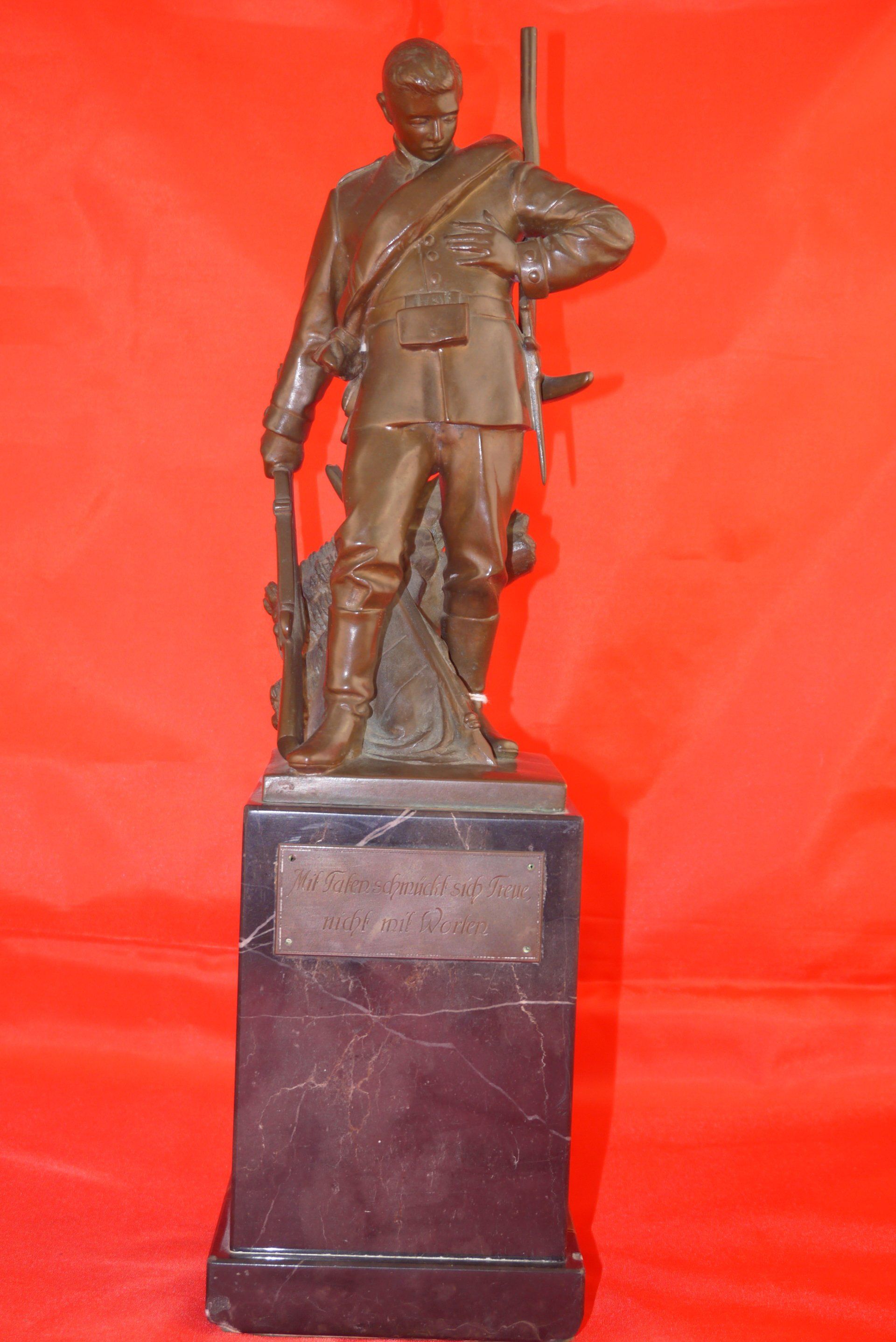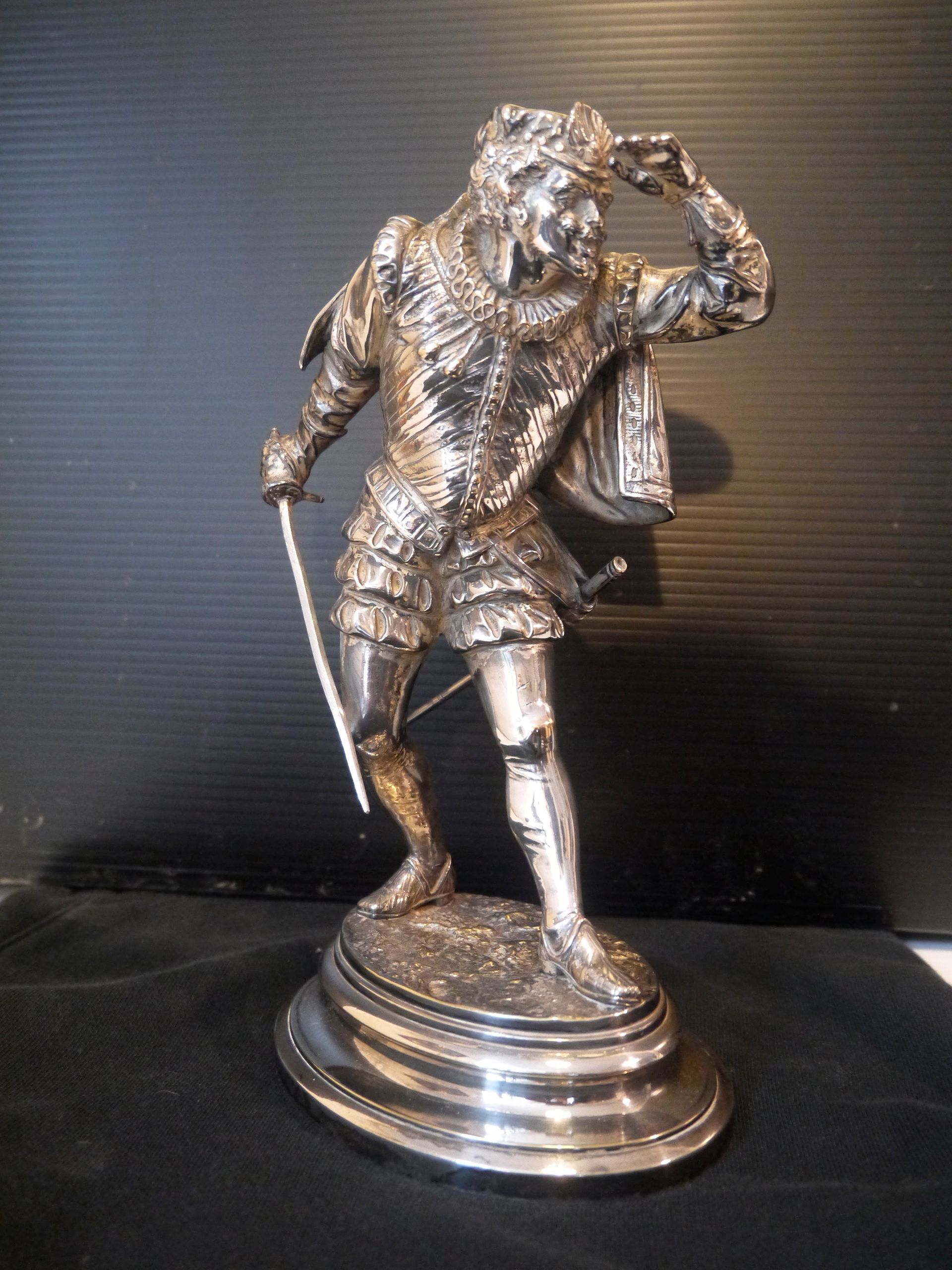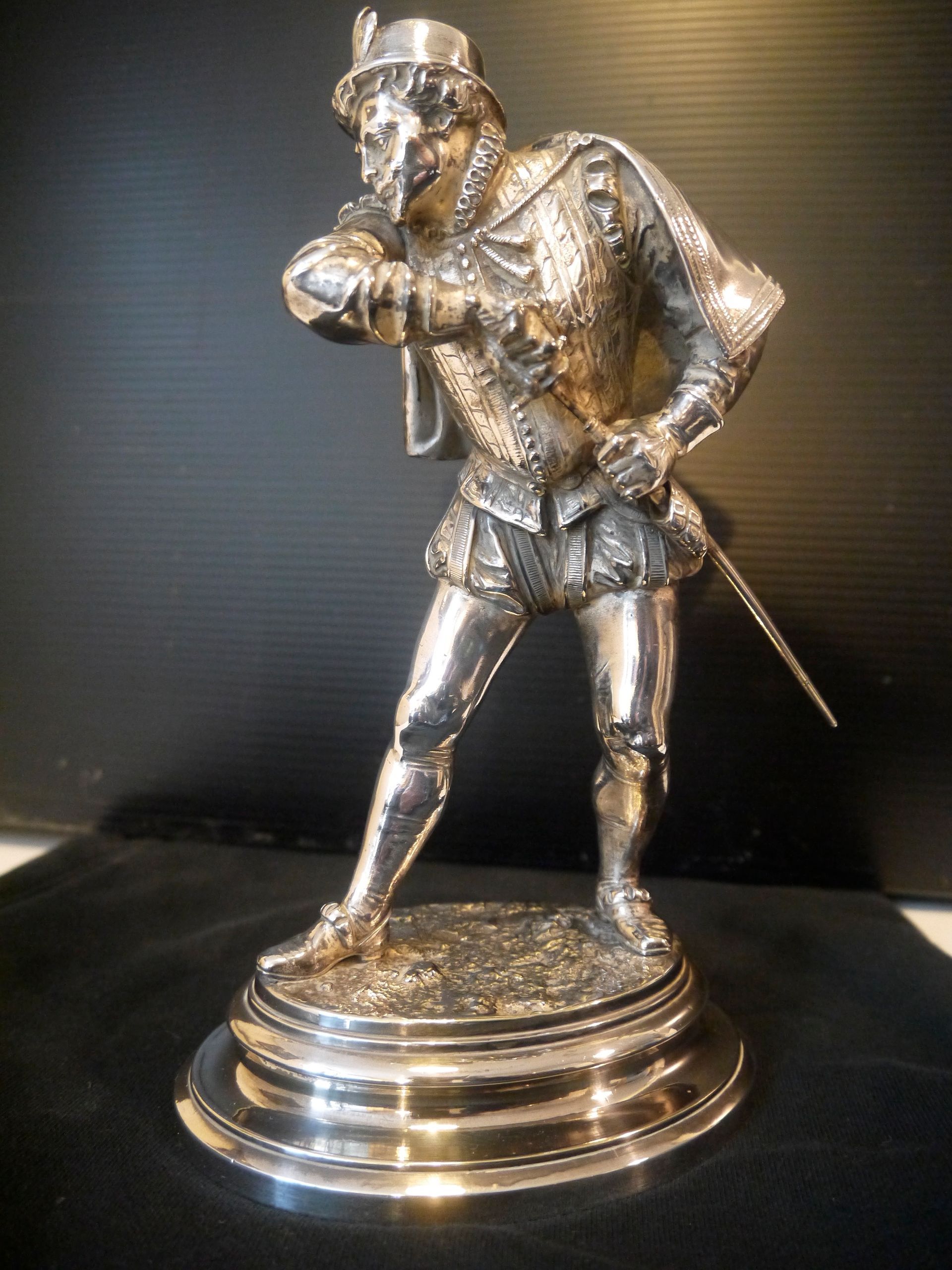 Emile Coriolan Hippolyte Guillemin (1841 – 1907), He started exhibiting at the Paris salon in 1870 and won an honourable mention in 1897. His bronzes are in many collections including the Montreal and Toul museums. He is best known for his many lovely, small-scale cavaliers and conquistadors – often in conflict. Accurate costuming, minute detailing, expressive faces and top French foundry work typify his sculptures. Silver plated bronze of a cavalier with a drawn sword, looking for battle, signed to the base, circa 1890. Size: 22.5cm tall.