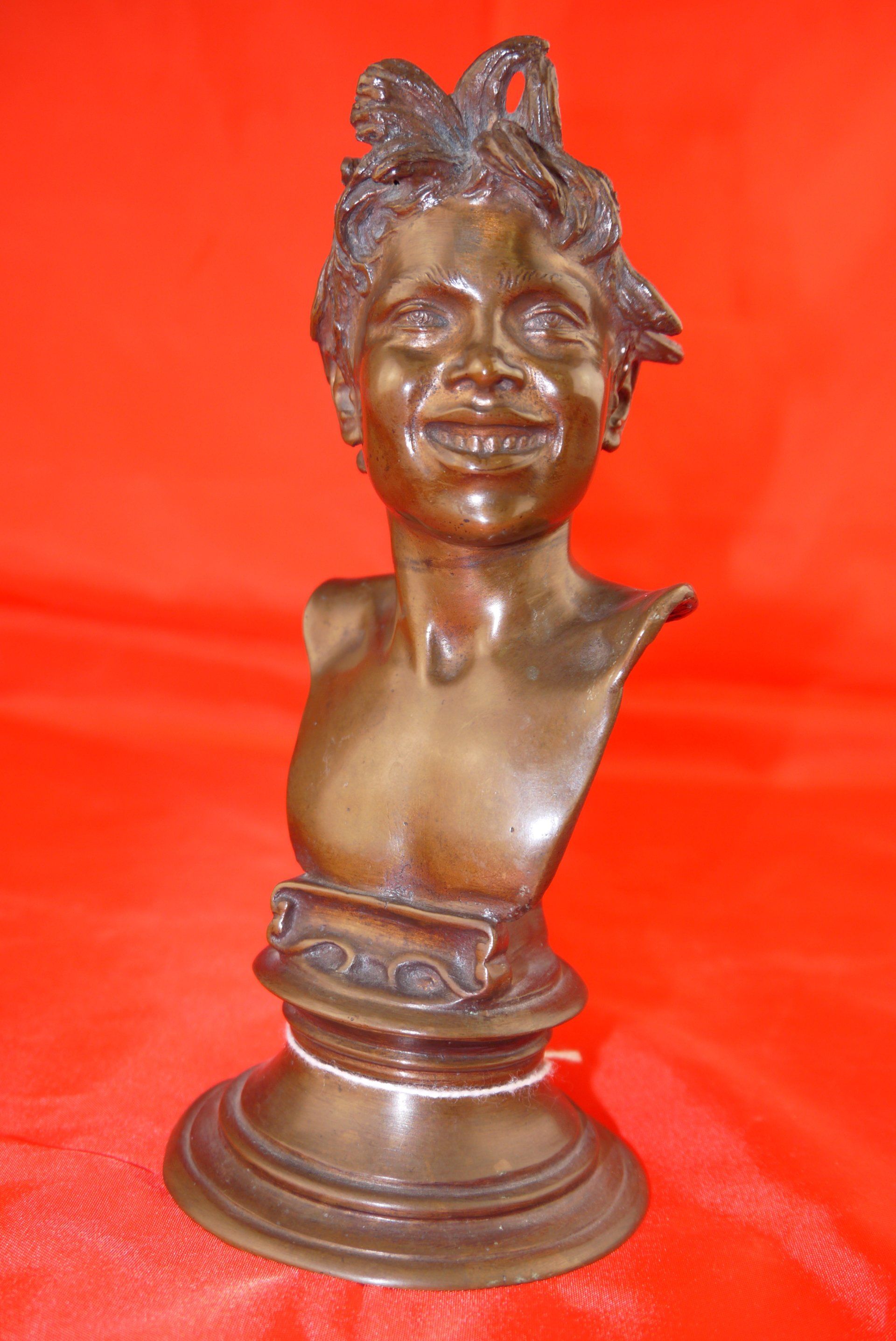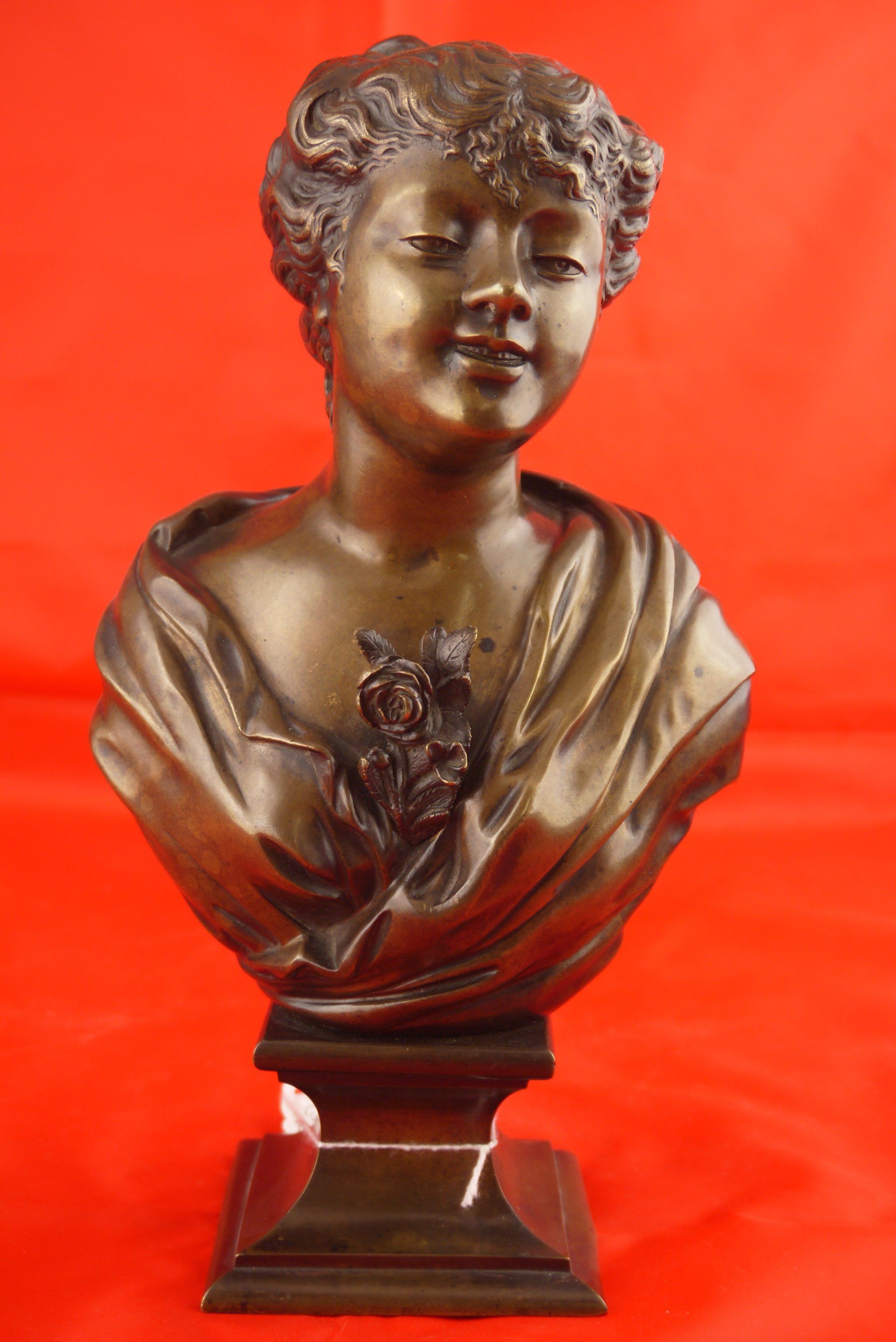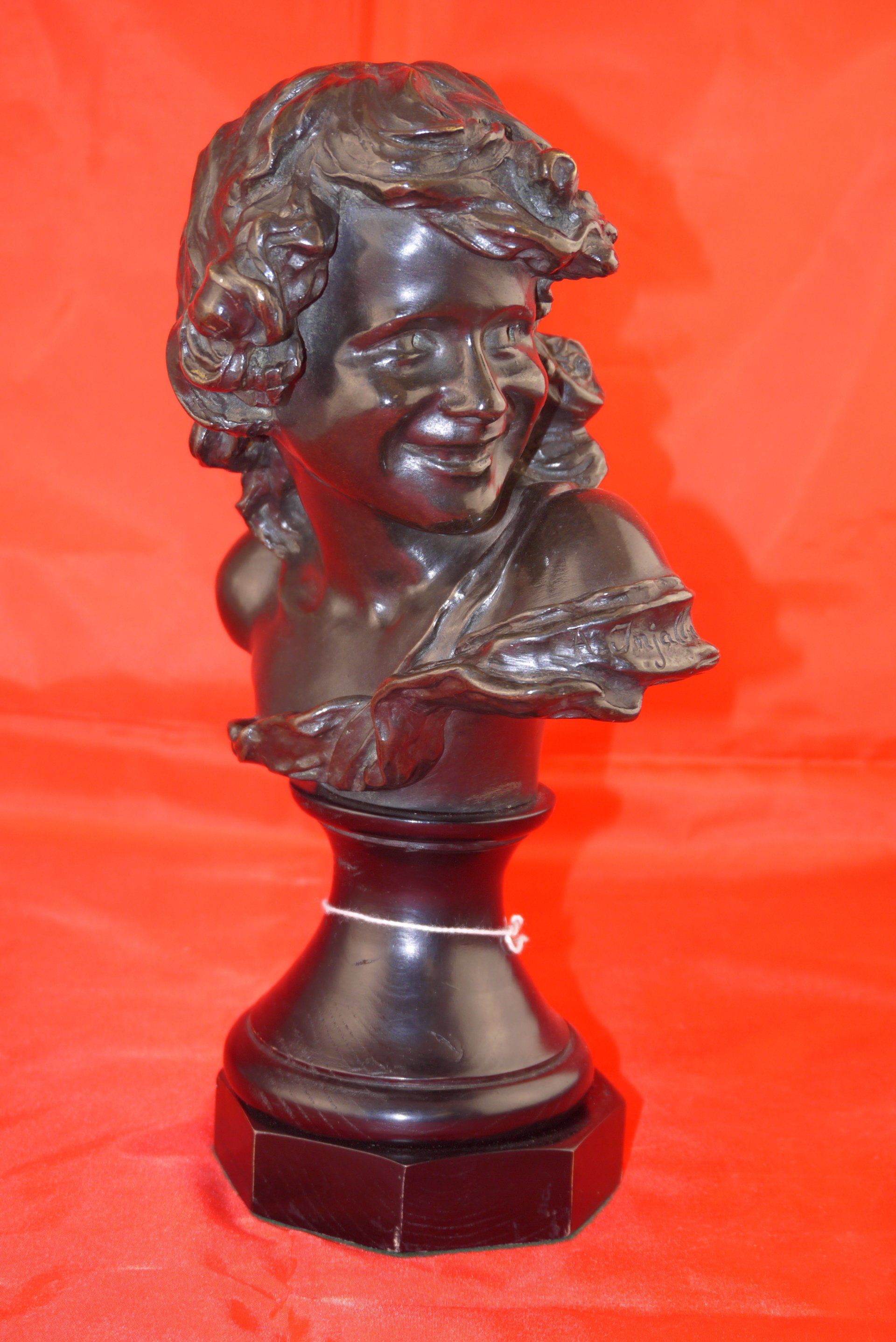 Jean-Antoine Injalbert (1845–1933) was a much-decorated French sculptor, won the prestigious Prix de Rome in 1874. At the Exposition Universelle of 1889 he won the Grand Prix, and in 1900 was a member of the jury. On the day of the inauguration of the Pont Mirabeau in Paris, Injalbert was made an officer of the Légion d'honneur. In 1905 he was made a member of the Institut de France, and in 1910 promoted to Commander of the Légion d'honneur. From about 1915 onwards he became influential as a teacher, at the Académie Colarossi and as chief instructor at the École des Beaux Arts. Bronze bust of a smiling young girl, signed, numbered with Soit Paris foundry mark, mounted on a wooden plinth. Size: 27.5 tall.
