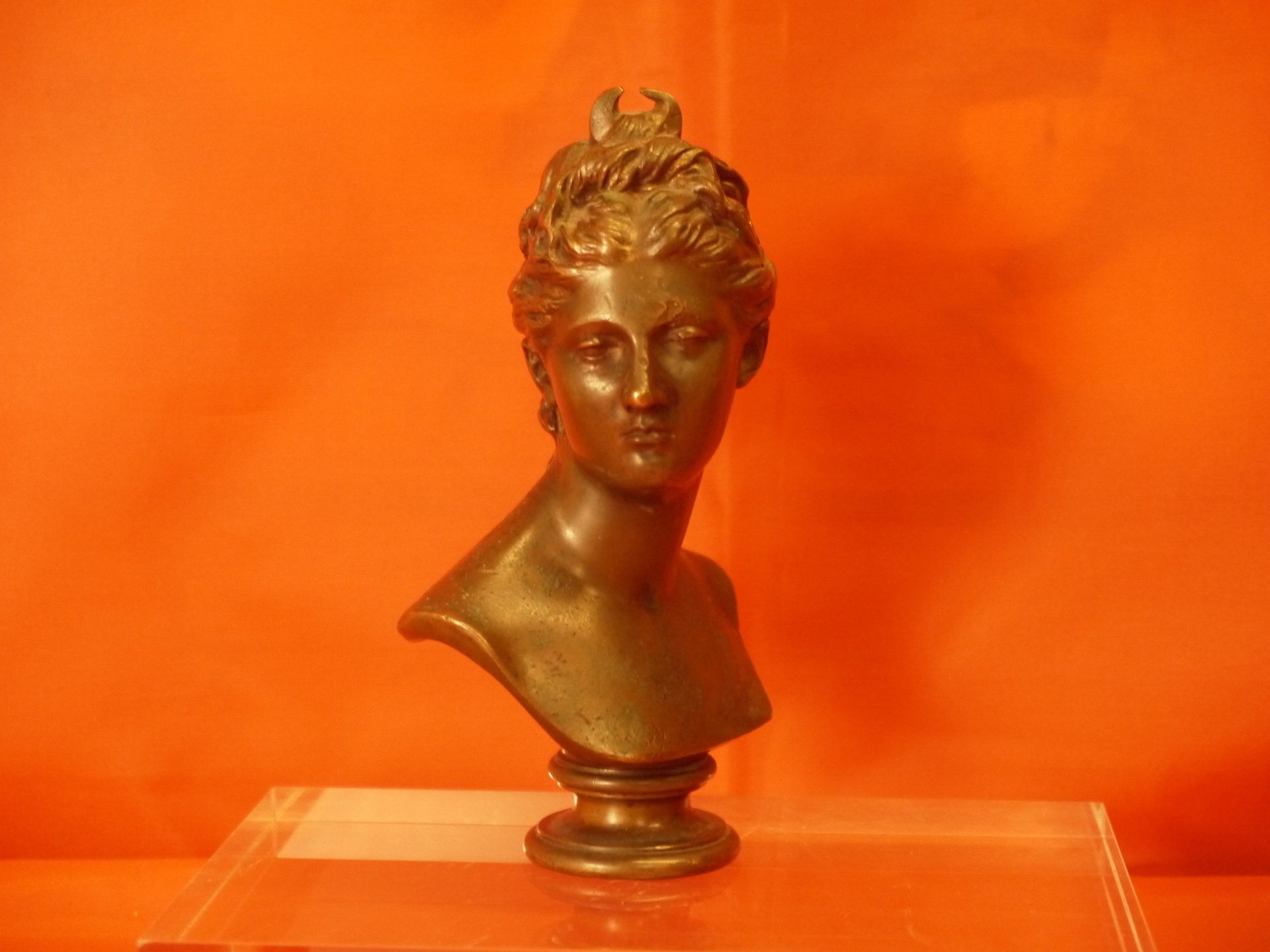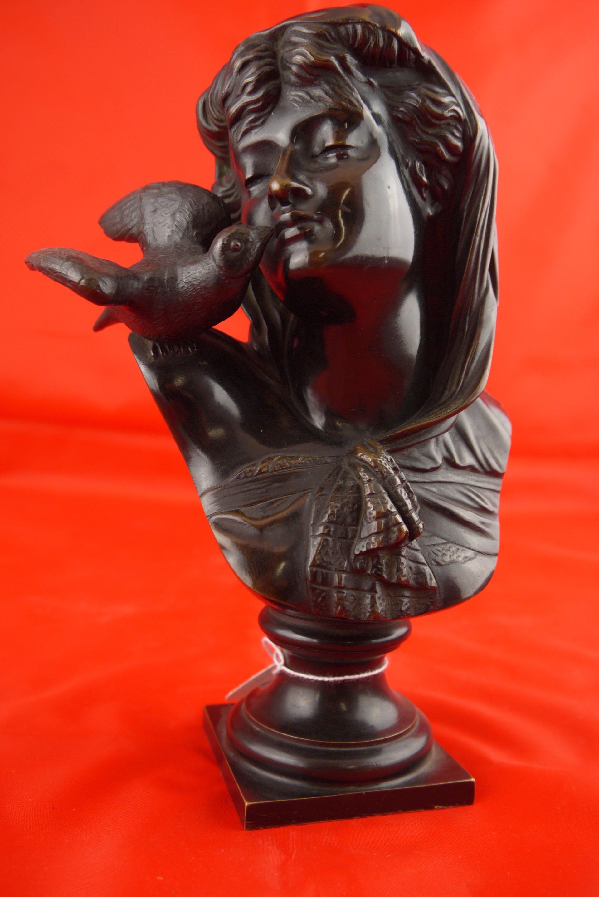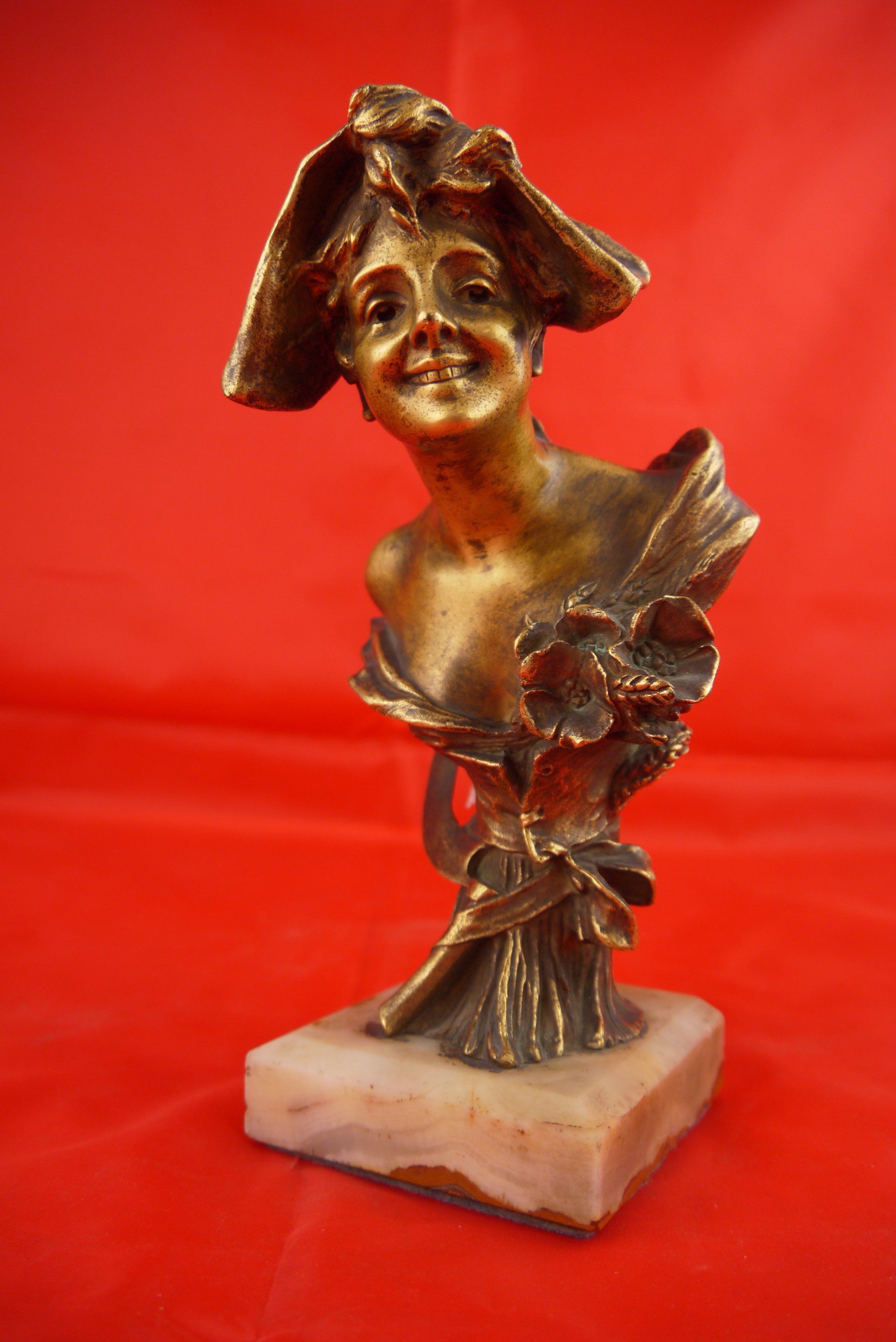 Jean-Antoine Injalbert (1845–1933) was a much-decorated French sculptor, won the prestigious Prix de Rome in 1874. At the Exposition Universelle of 1889 he won the Grand Prix, and in 1900 was a member of the jury. On the day of the inauguration of the Pont Mirabeau in Paris, Injalbert was made an officer of the Légion d'honneur. In 1905 he was made a member of the Institut de France, and in 1910 promoted to Commander of the Légion d'honneur. From about 1915 onwards he became influential as a teacher, at the Académie Colarossi and as chief instructor at the École des Beaux Arts. Bronze bust of a smiling young girl, signed, numbered with Soit Paris foundry mark, mounted on a wooden plinth. Size: 27.5 tall.