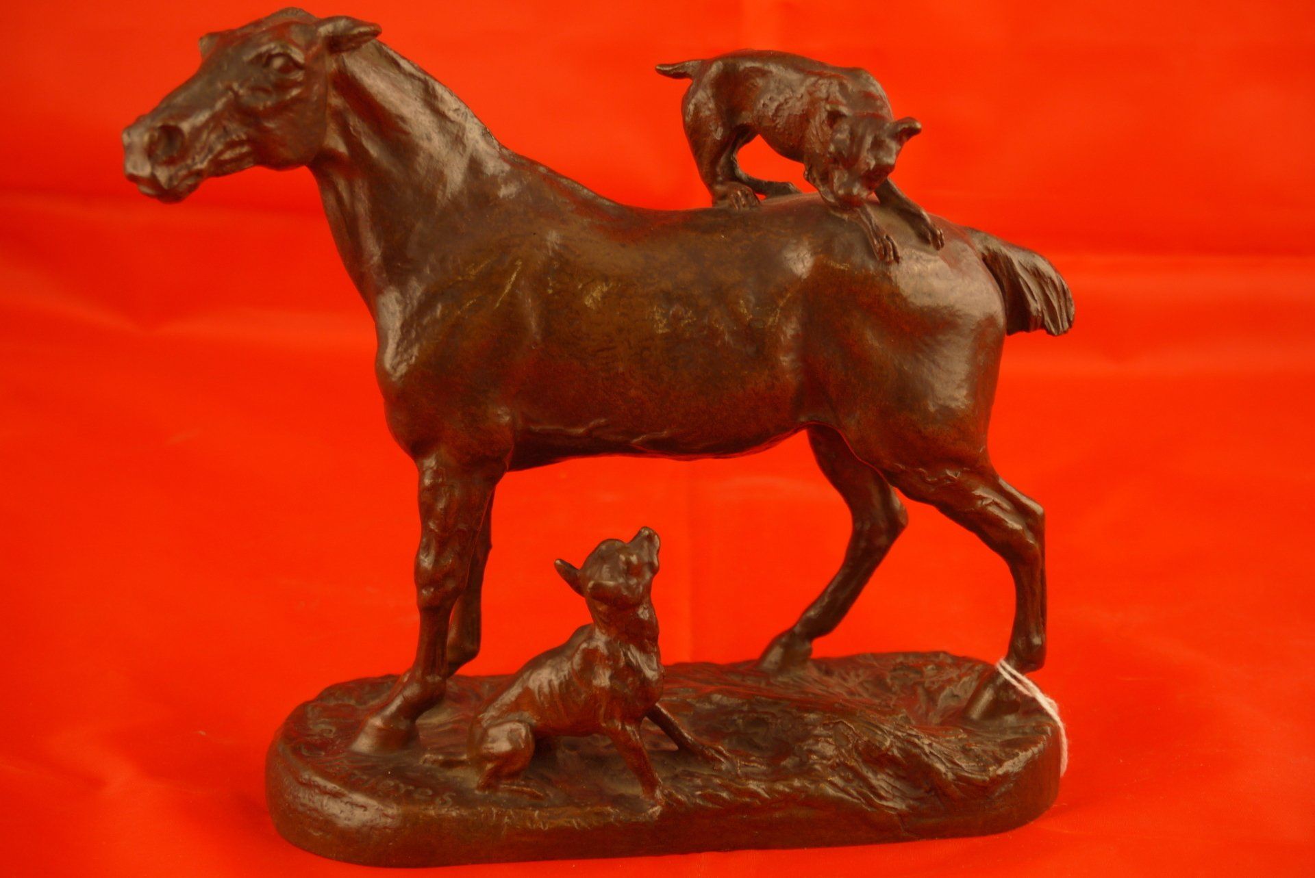 Louis Francois Georges, Comte de Ferriers (1837-1907), Born in Paris, he exhibited widely at the Paris Salon from 1865-93, showing wax and plaster groups mainly of dogs but also horses and other animals. Bronze of two dogs playing on and around a horse, signed, with foundry stamp and numbered. Size: 17cm tall.