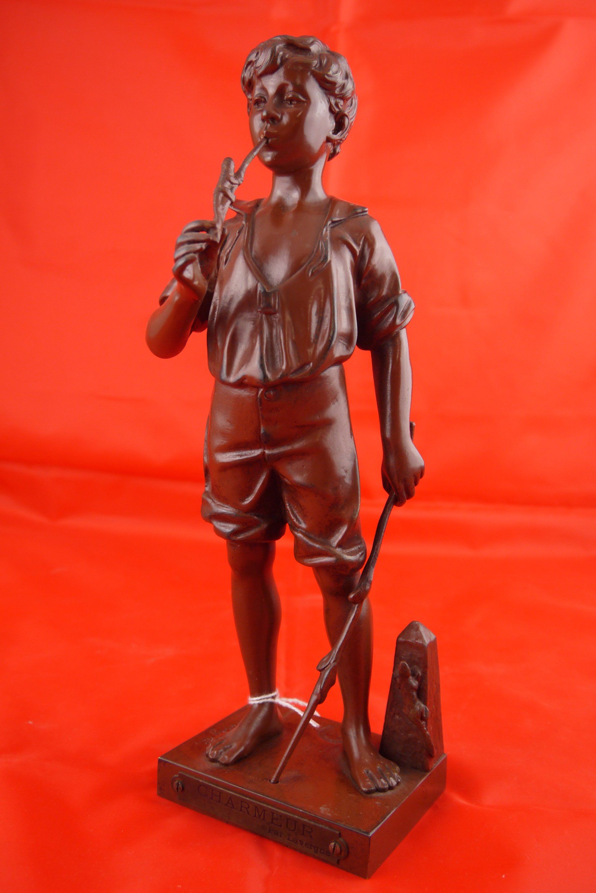 Charmeur de Lézards (The Lizard Charmer) by Adolphe Jean Lavergne (1852-1901), a 19th century, bronze study; the boy blowing a pipe in one hand and holding a stick in the other, with lizard on a post, to rear corner of the base, raised on a square plinth with attached plaque 'Charmeur par Lavergne'. Signed with foundry stamp. Size: 28.5cm tall.