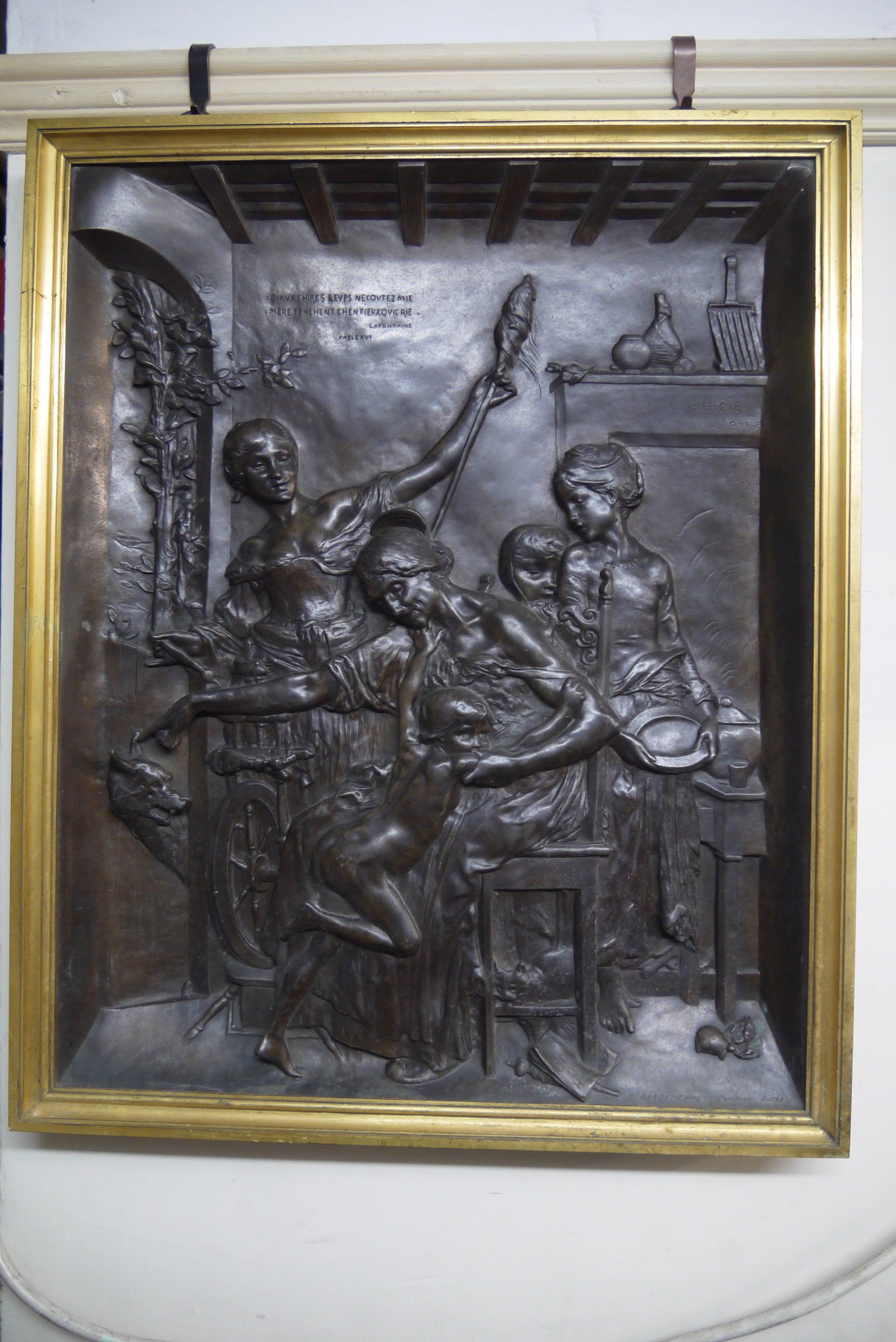 Bronze plaque of a Scene from La Fontaine's fable XVI, Depicting a group of women and children at a spinning mill, with a wolf at the door, inscribed: "BIAUX CHIRES LEUPS, N'ECOUTEZ MIE / MERE TENCHENT CHEN FIEVX QUI CRIE" / LA FONTAINE / FABLE XVI; signed and dated 1873 by Marius Jean Antonin Mercié (1845 - 1916). Foundry mark for F. Barbedienne, Fondeur, Paris. Size: 53cm high x 43.2cm.