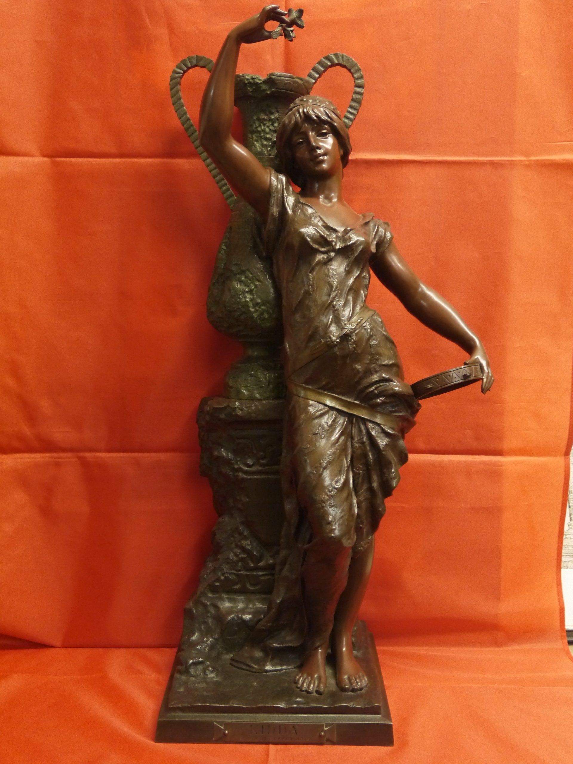 Kidda, salon des Beaux Arts. Statue of a lady, with a tambourine in one hand, holding a branch aloft in the other, standing in front of an urn. 19th century, double patination bronze statue by George Charles Coudray (1862 – 1932) Foundry mark for Societe des Bronze de Paris, signed and numbered. 74 cm tall.