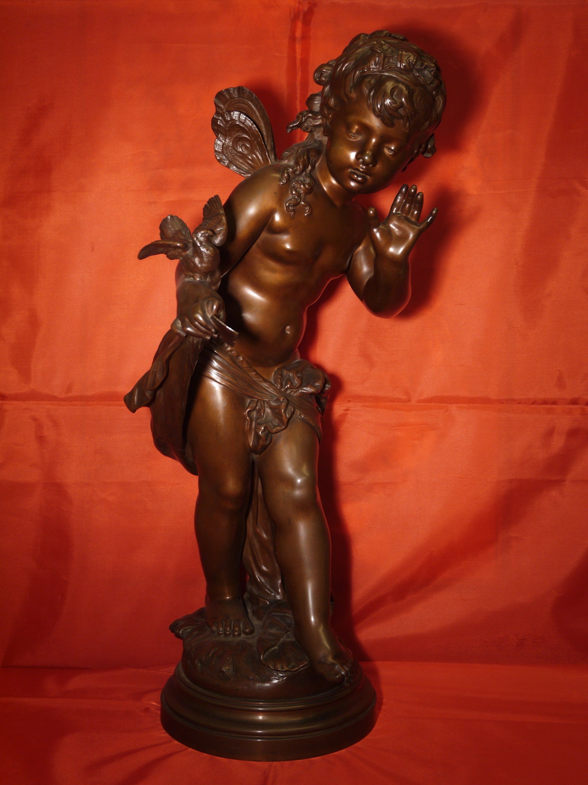 The message, a 19th century bronze statue signed Auguste Moreau, of a Cupid/Cherub holding a love letter with a dove on her arm. Marked M.A. inside the base. 53 cm tall.