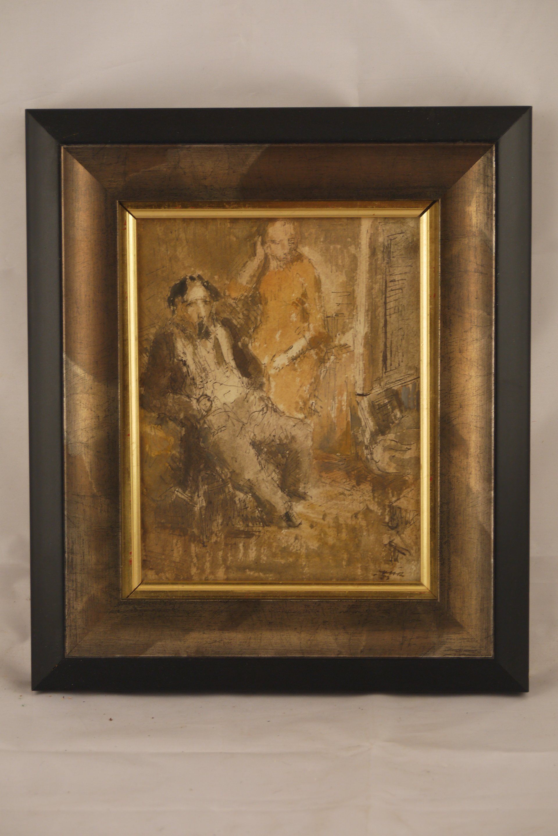 Watercolour and ink scene of man seated with lady standing to his left. by Harold Hope Read (1881-1959) exhibited at the New English Art Club, Alpine Gallery, Royal Institute of Painters in Watercolours, National Society of Painters Sculptors and Gravers, The Pastel Society and the National Society of British Artists. He exhibited at the Royal Academy in 1927. Framed size: 24 high x 21cm.