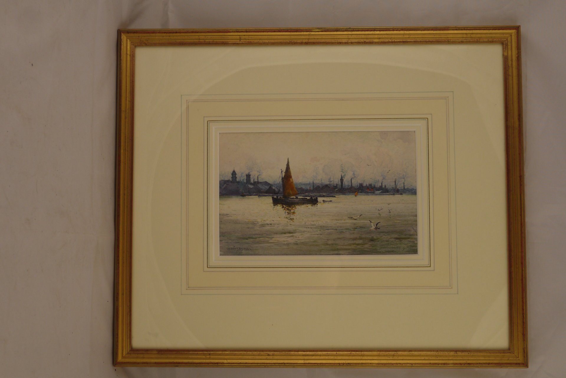Hely Augustus Morton Smith RBA FRSA (1862–1941) Exhibited at the following:-Royal Society of Artists, Birmingham; Dudley Gallery; Glasgow Institute of Fine Arts; Walker Gallery, Liverpool; Royal Academe; Royal Society of British Artists, Ridley; Royal Institute of Oil Painters; Royal Scottish Academy; Walker Gallery, London; Society of British Artists, Suffolk Street; St Ives Society of Artists 1934, and thirty seven Touring Shows. Signed, watercolour view on the river Thames. Framed size: 37.5cm high x 45cm.