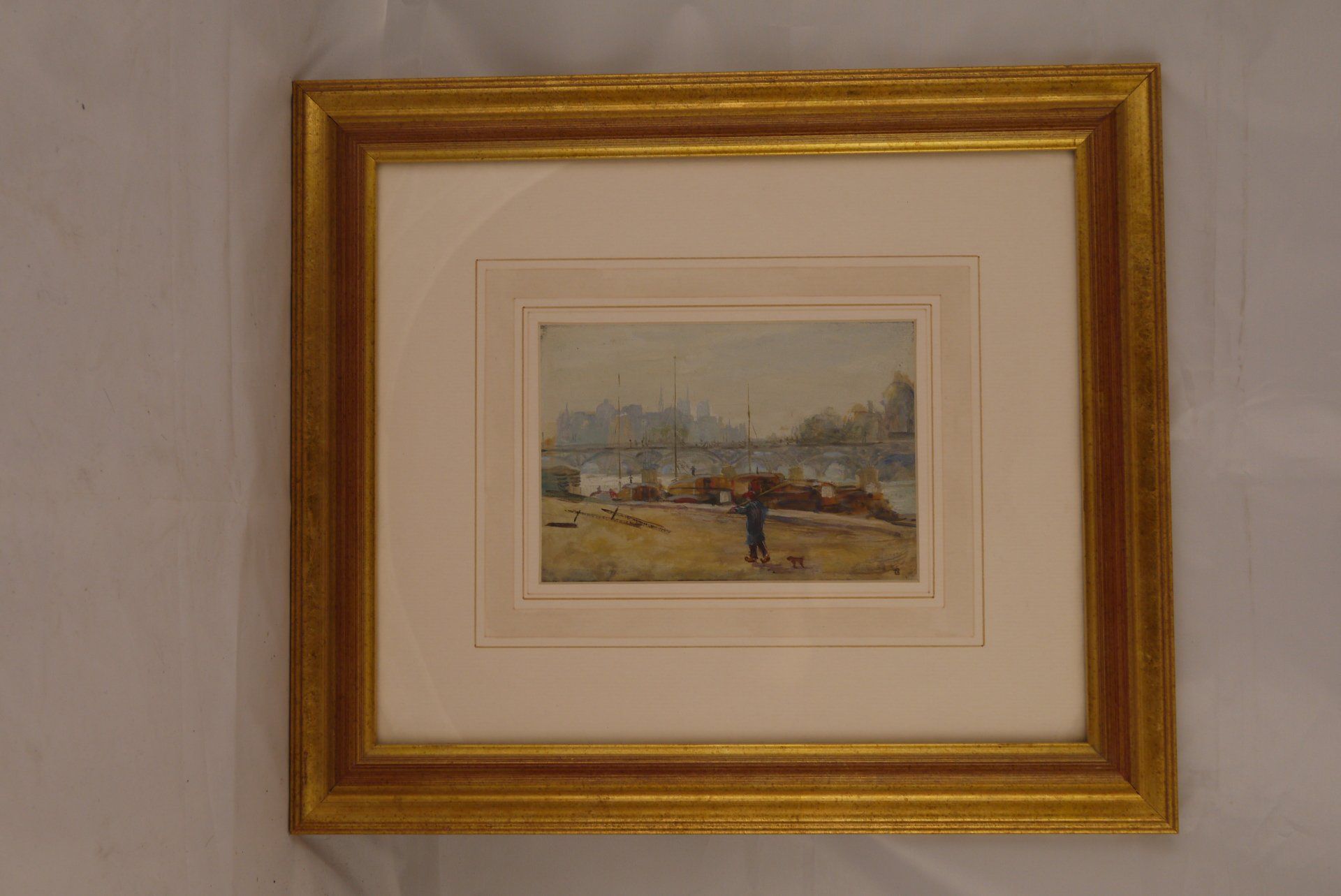 Sir Frank William Brangwyn RA RWS RBA (12 May 1867 – 11 June 1956) was an Anglo-Welsh artist, painter, water colourist, virtuoso engraver, illustrator, and progressive designer. Gouache, of a man walking his dog passed moored boats, with the Pont Des Arts and the Paris skyline in the background, monogrammed FB. Framed size: 34cm high x 39cm.