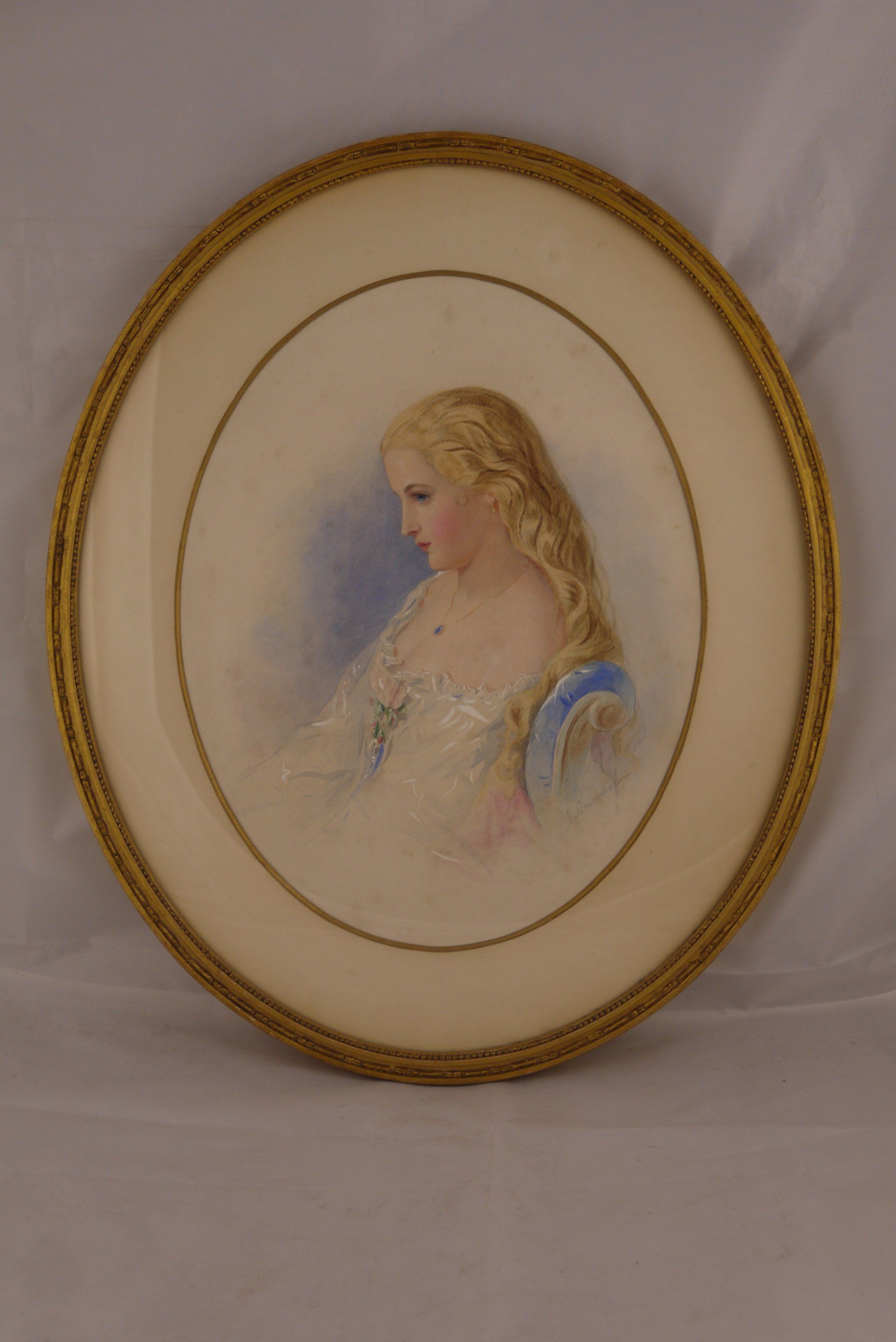 Watercolour of a beautiful young lady by John Simmons (1823 – 1876). Simmons main output was portraiture. His Titania is in the collection of Bristol Museum and Art Gallery and was included in the exhibition Victorian Fairy Painting at the Royal Academy in 1997-1998. Exhibited:- Chilterns, Amersham Common; Bucks; Goupil Gallery; Walker Art Gallery, Liverpool; New English Art Club; Royal Society of Portrait Painters; Royal Academy; Royal Society of British Artists: Royal Institute of Oil Painters. Frame size: 47cm high x 39.5cm