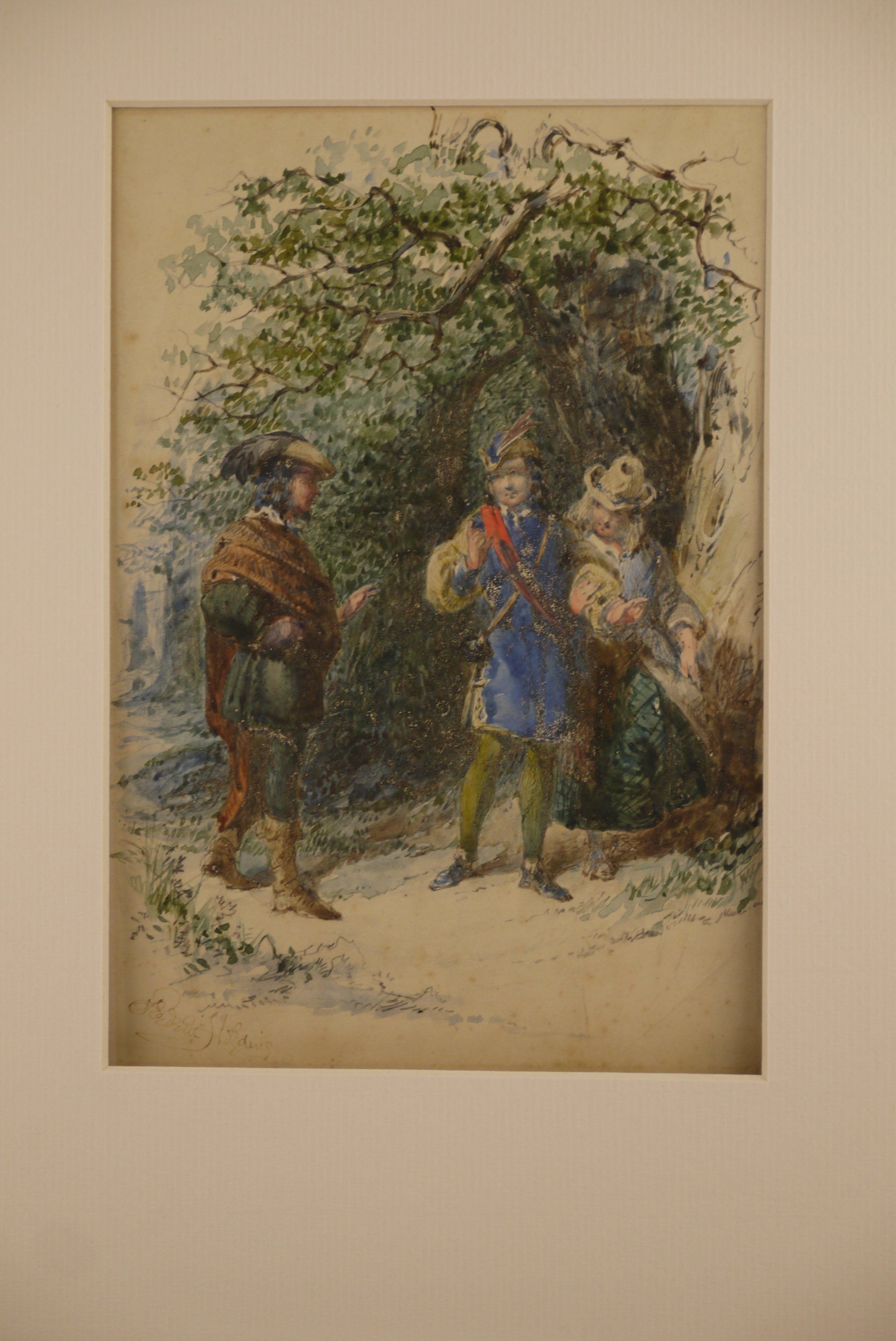 Shakespeare's As You Like It, scene, watercolour by Frederick Holding (1817-1874) of Manchester, created illustrations for books including Southey's ‘Battle of Blenheim,’ in 1864. In his later years, he was a scenic artist at the Theatre Royal and the Prince's Theatre, Manchester. There are two illustrations of Shakespearean subjects in the Victoria and Albert Museum collection. Image size: 21.5cm high x 14.5cm.