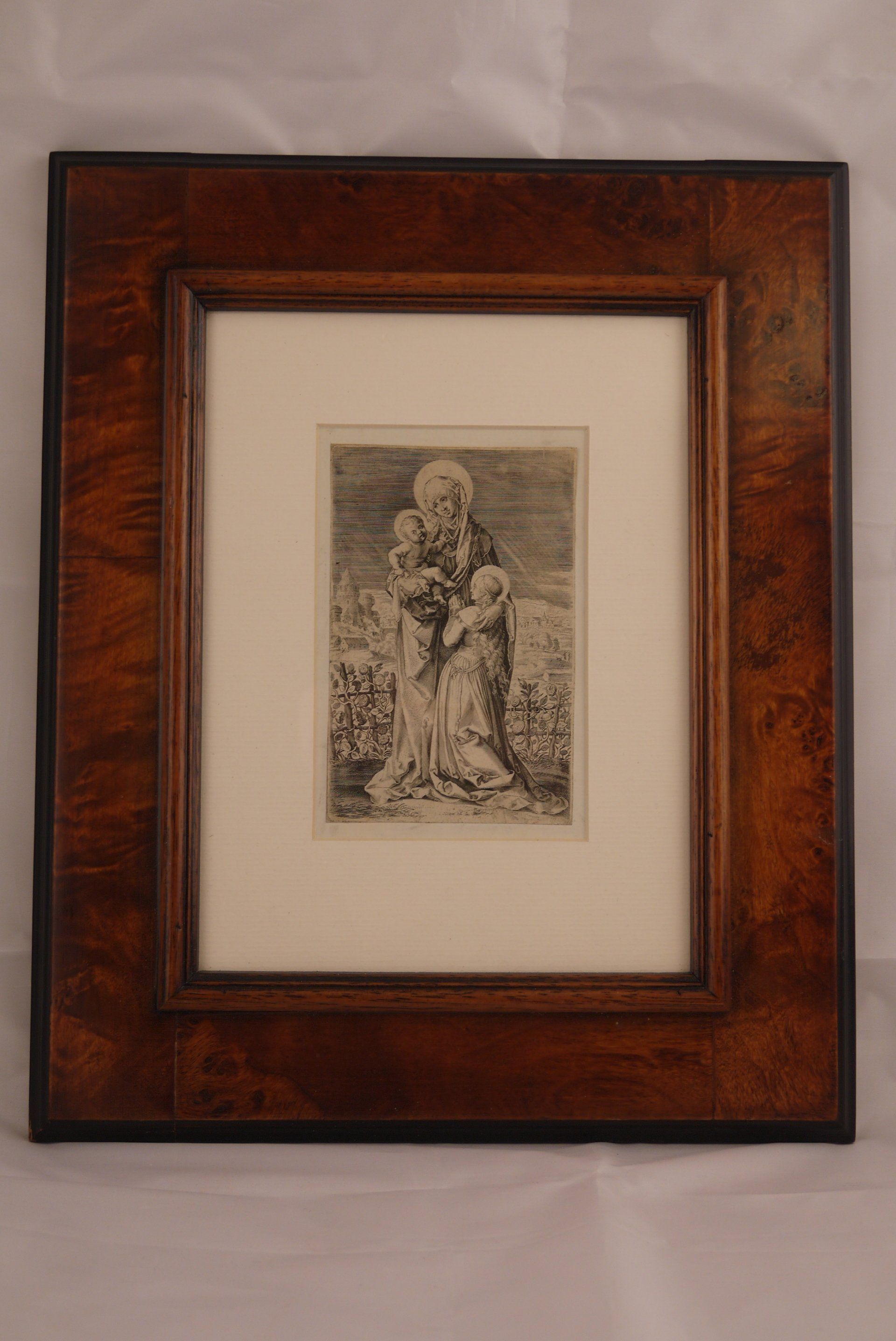 The Virgin holding Christ as a child, Saint Anne kneeling in front of her, a city beyond; after Durer; Print made by Aegidius Sadeler II; Date: 1585 – 1627). Aegidius Sadeler II (circa 1570 – 1629) also known as: Sadeler, Aegidius; Sadeler, Gillis; Sadler, Gillis; Sadeler, Egidius; Sadeler, Aegedius. A Flemish painter and engraver. Framed Size: 34.5cm high x 28.5cm.