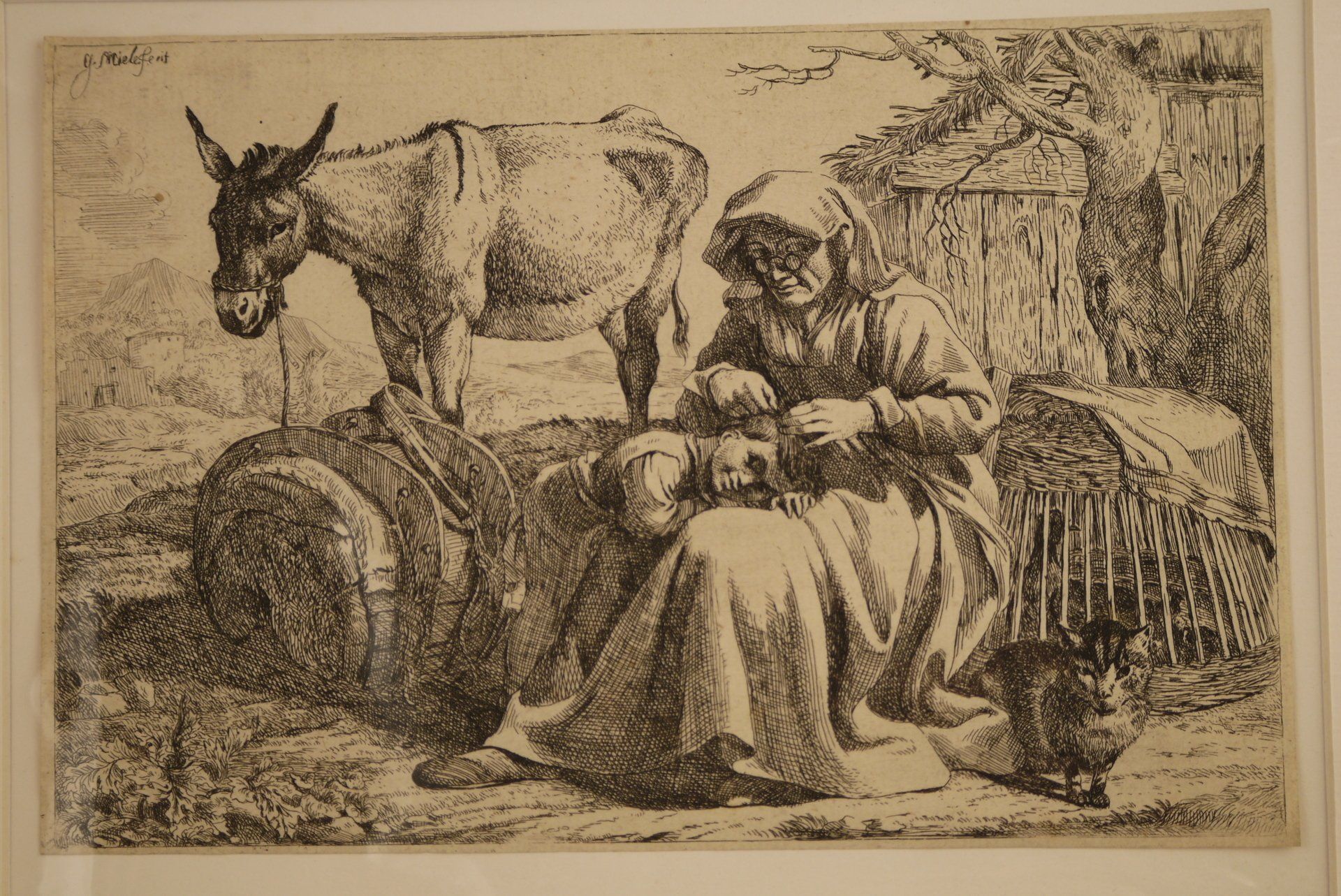 A woman seated, wearing spectacles picking fleas from a boy's head, next to a donkey and cat. Etching by Jan Giovanni Miel (1599 - 1664) Painter and etcher, active in Italy. Pupil of Gerhard Seghers; in Rome 1636-1658; in Turin 1658-1664 as court painter of Charles Emmanuel; pupil of Andrea Sacchi. Image size: 14cm high x 21cm.