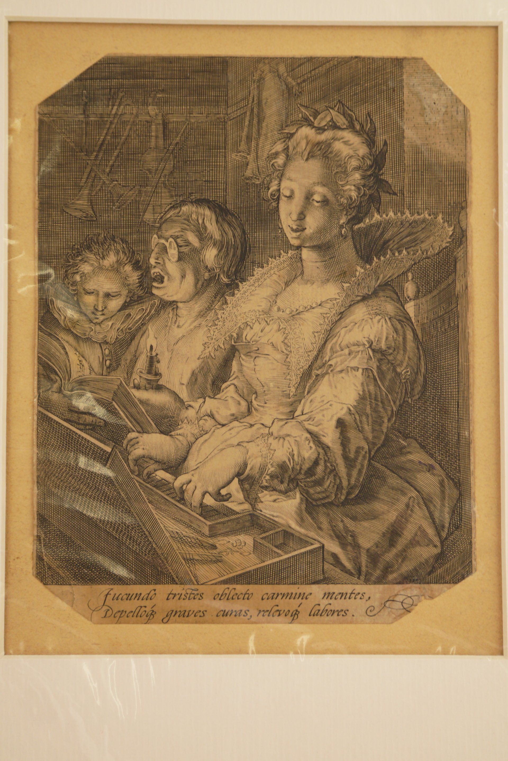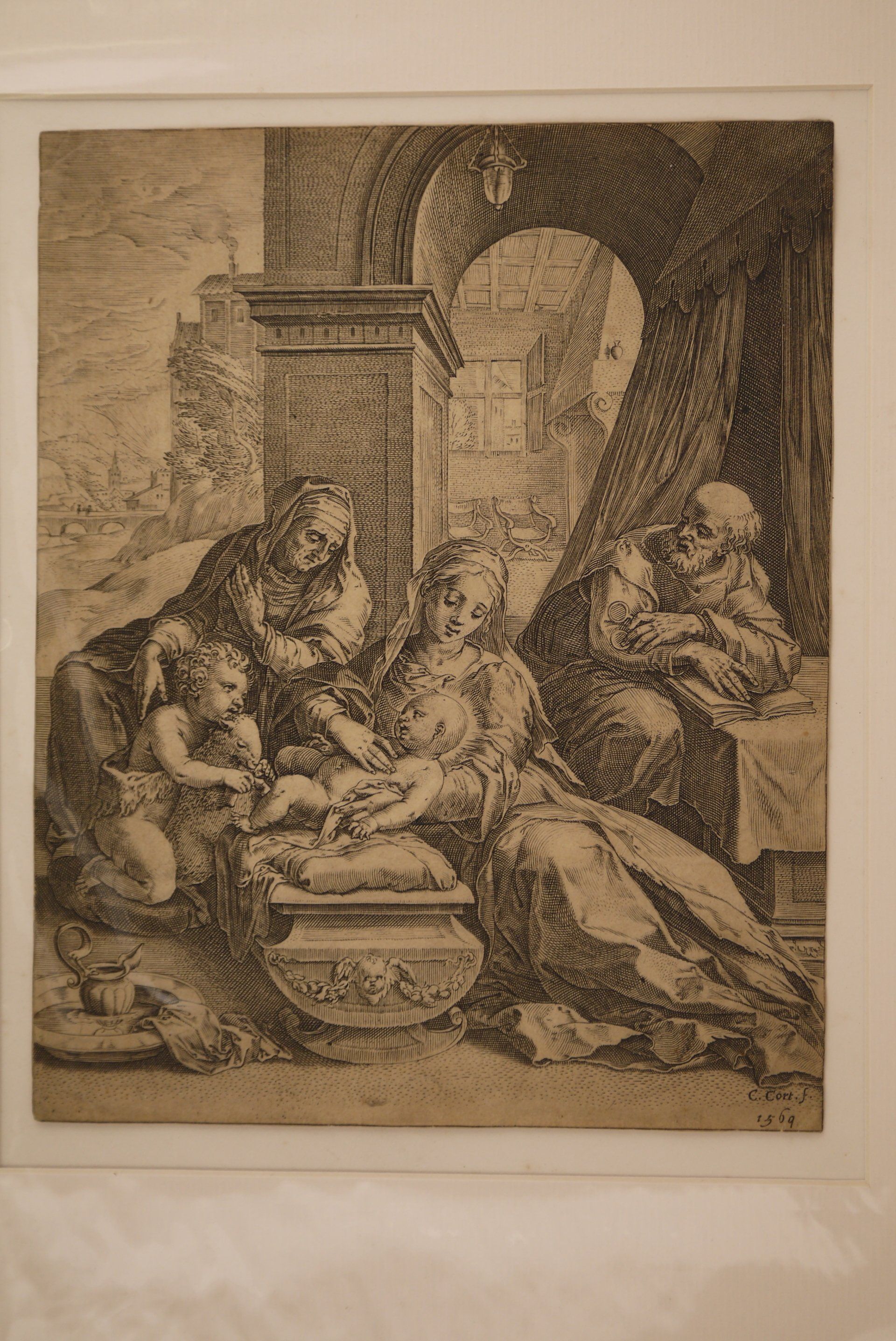 Etching of the Holy Family with St Anne and St John the Baptist; beyond is a room with two chairs and a fireplace; St John clutches the legs of a lamb and kneels before the Christ child. Circa 1569. Print made by: Cornelis Cort (1533 – 1578) After: Taddeo Zuccaro ? (1529-1566) Published by: Antoine Lafréry (1512-1577). Overall size: 23.9 cm high x 19cm.