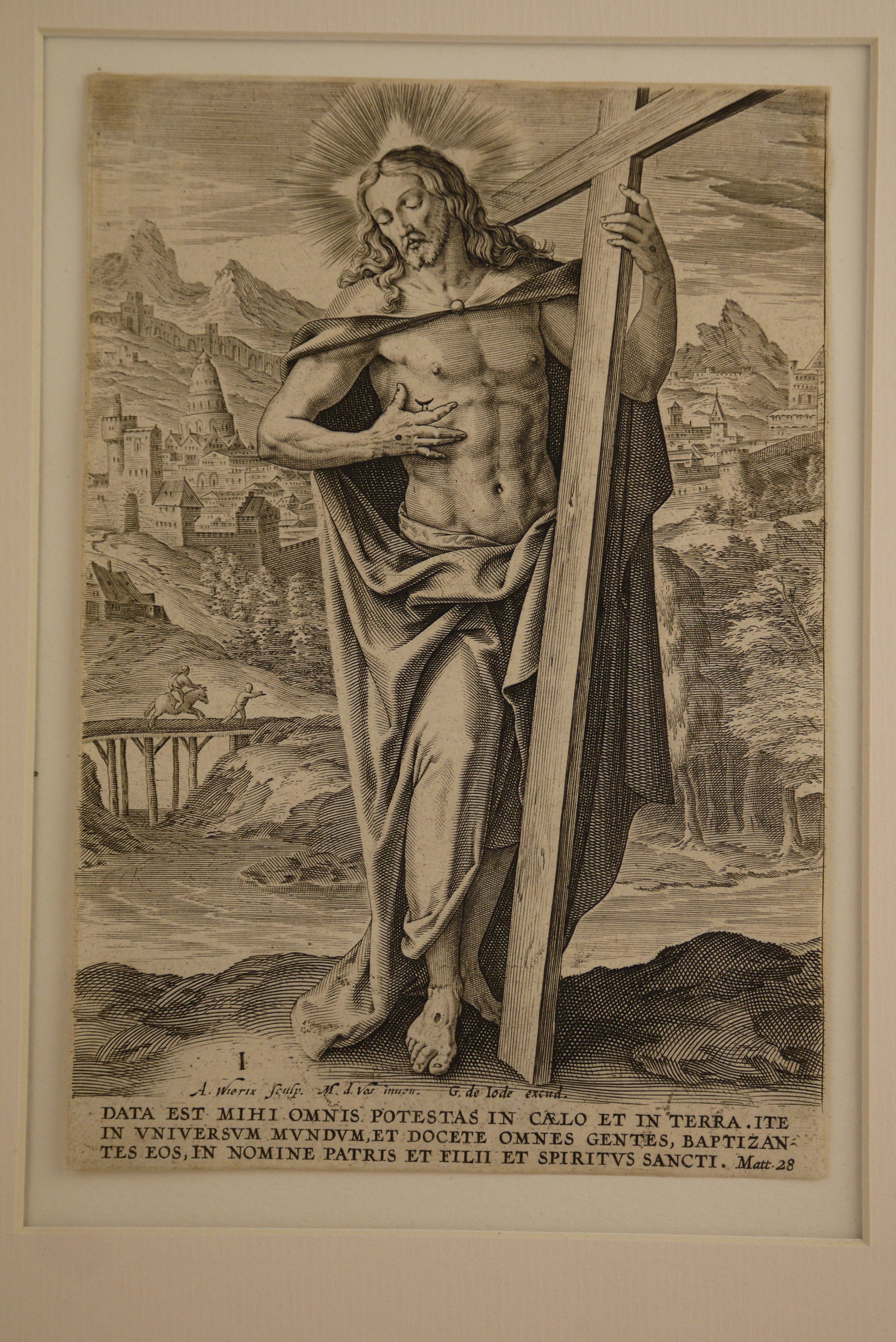 Christ standing, holding the cross, his wound exposed, city-scape in the background, circa 1585; Engraving from the Series: The Twelve Apostles, Print made by: Antonius Wierix (1555/1559-1604), After: Maarten de Vos (1532-1603), Published by: Gerard de Jode (1516/17-1591). Overall size: 20.2 cm high x 13.7cm.