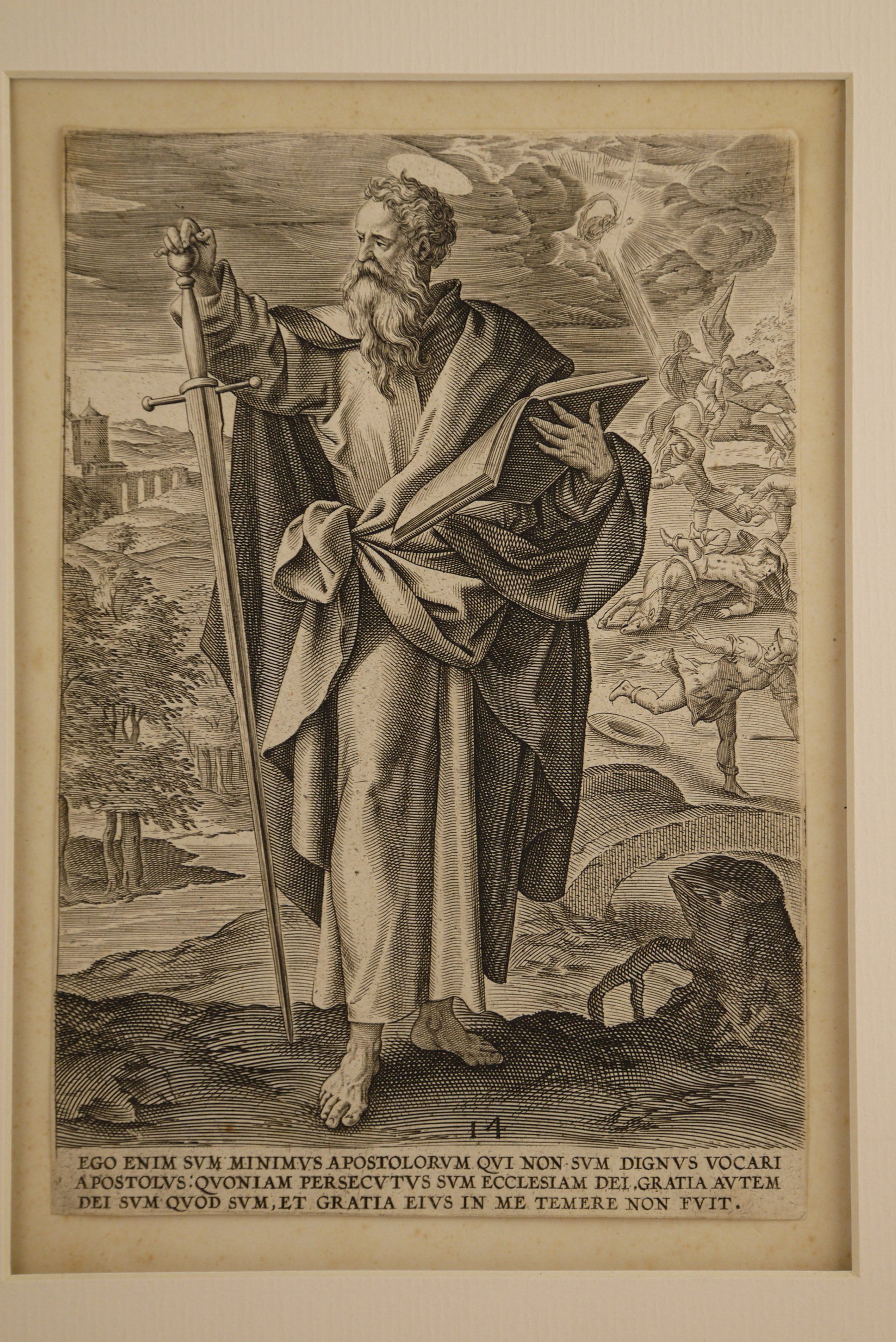 St Paul standing, holding a sword in his right hand and open book in the left, his conversion in the background. circa 1585; Engraving from the Series: The Twelve Apostles, Print made by: Antonius Wierix (1555/1559-1604), After: Maarten de Vos (1532-1603), Published by: Gerard de Jode (1516/17-1591). Overall size: 20 cm high x 13.7cm.