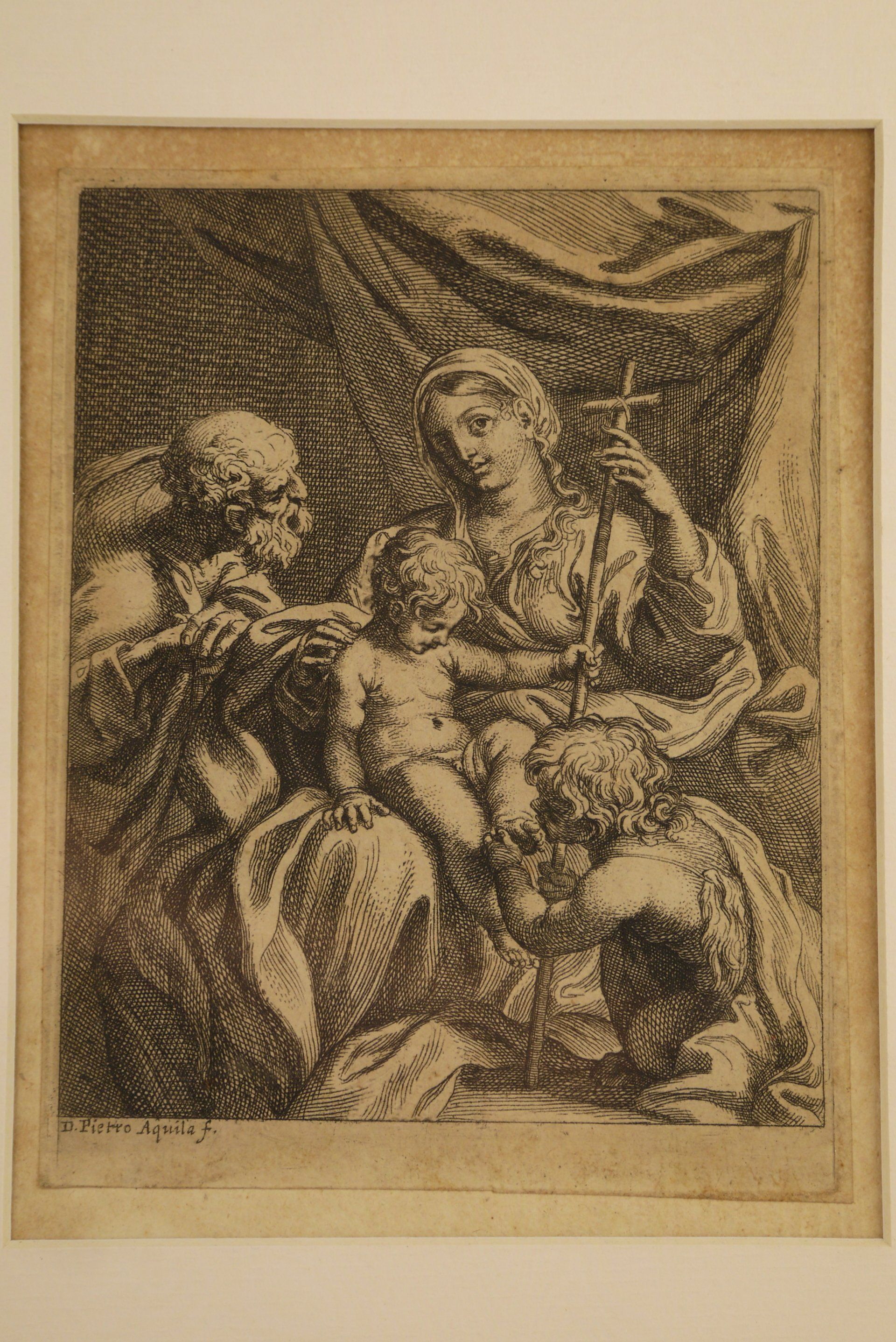 Etching by Pietro Aquila (1630 – 1692) who was an Italian painter and printmaker of the Baroque period. Saint Mary (the Blessed Virgin) and Saint Joseph with Christ child and Saint John the Baptist. Image size: 14.8cm tall x 11.7cm.