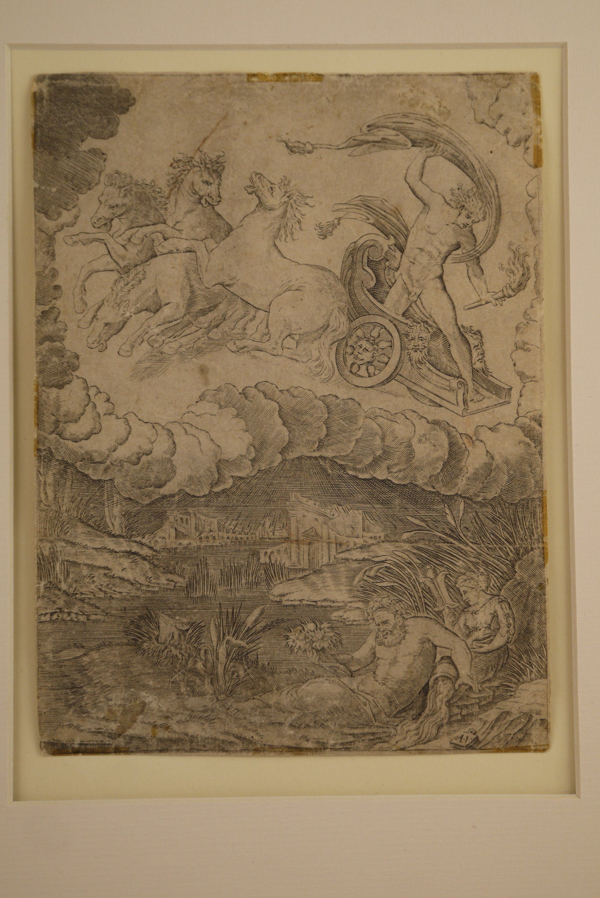 Agostino Veneziano ("Venetian Agostino"), whose real name was Agostino de' Musi (c. 1490 – c. 1540), was an important and prolific Italian engraver of the Renaissance. This etching on watermarked lined paper monogrammed in the plate is possibly of the god Sol riding chariot in the heavens above a city with man in the foreground holding a bunch of flowers in one hand and a water jug in the other. Overall Size: 18.7cm high x 14cm.