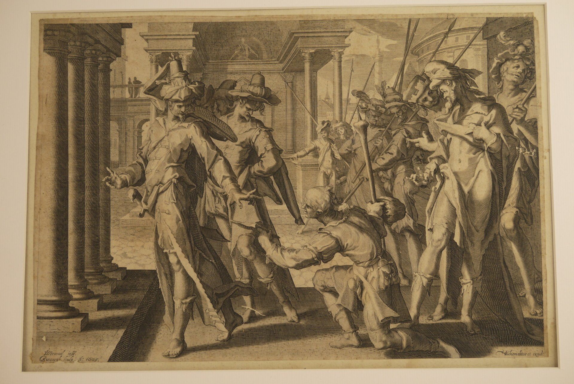 Allegory of Justice depicting a street scene with a shepherd giving a sheet of paper to a judge at left, who rejects it, from Thronus Justitiae, tredecim pulcherrimus tabulis..., plate 11 (A series of 13 Pictures of Justice by Joachim Wtewael'). The print maker Willem Isaacsz van Swanenburg (1580 – 1612), was a Dutch Golden Age engraver. After Joachim Wtewael (1566 – 1638) Published by Christoffel van Sichem I (1546 – 1624) in 1605. Image size: 25.5 cm tall x 17.4cm.