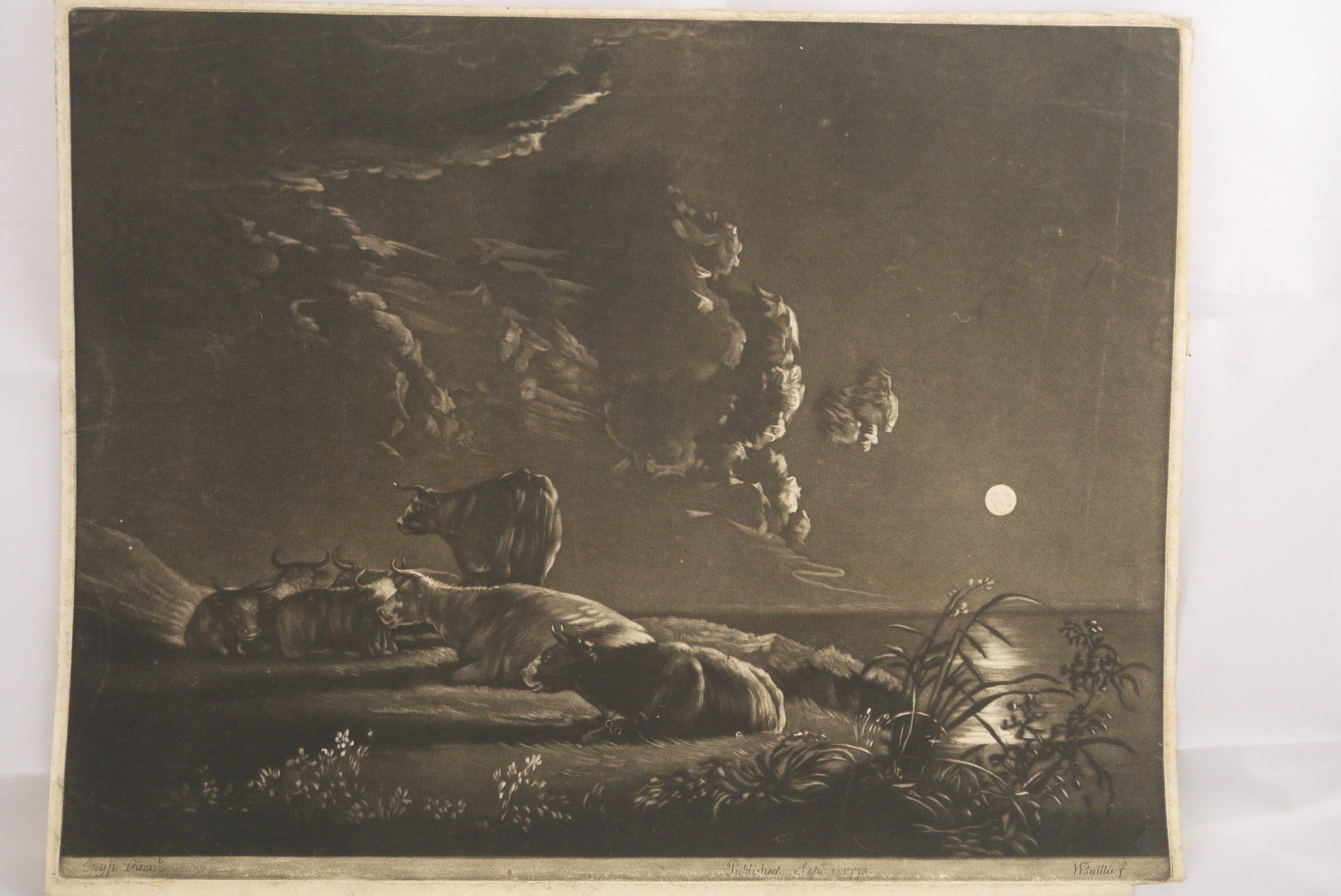 Moonlight mezzotint by Captain William Baillie (Killbride, 1723 – 1810, London) often known as "Captain William Baillie" was an Irish printmaker, after Aelbert Cuyp (1620-1691), Cattle on a Riverbank by Moonlight, Published September 1773. Plate size:28cm tall x 35.5cm.