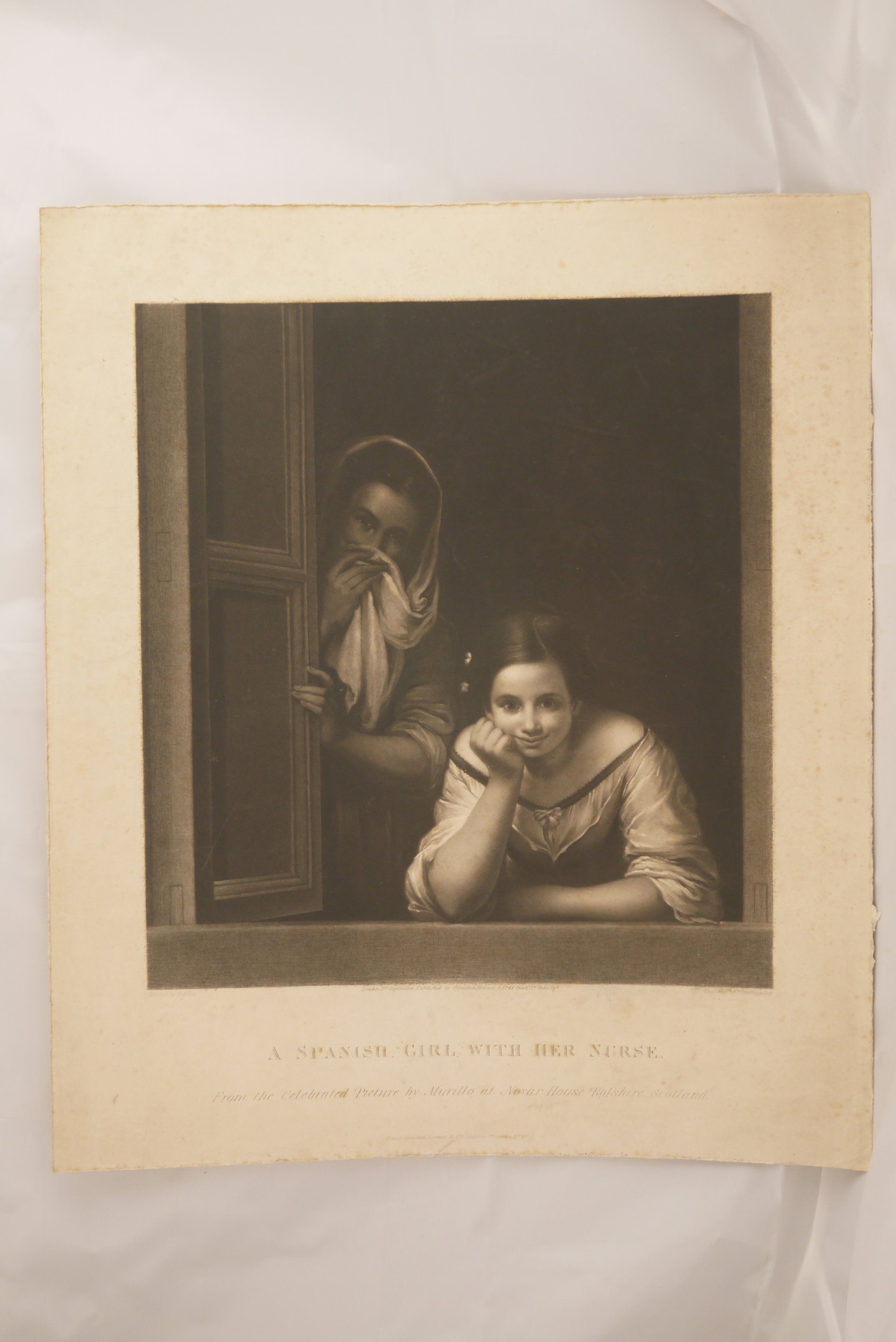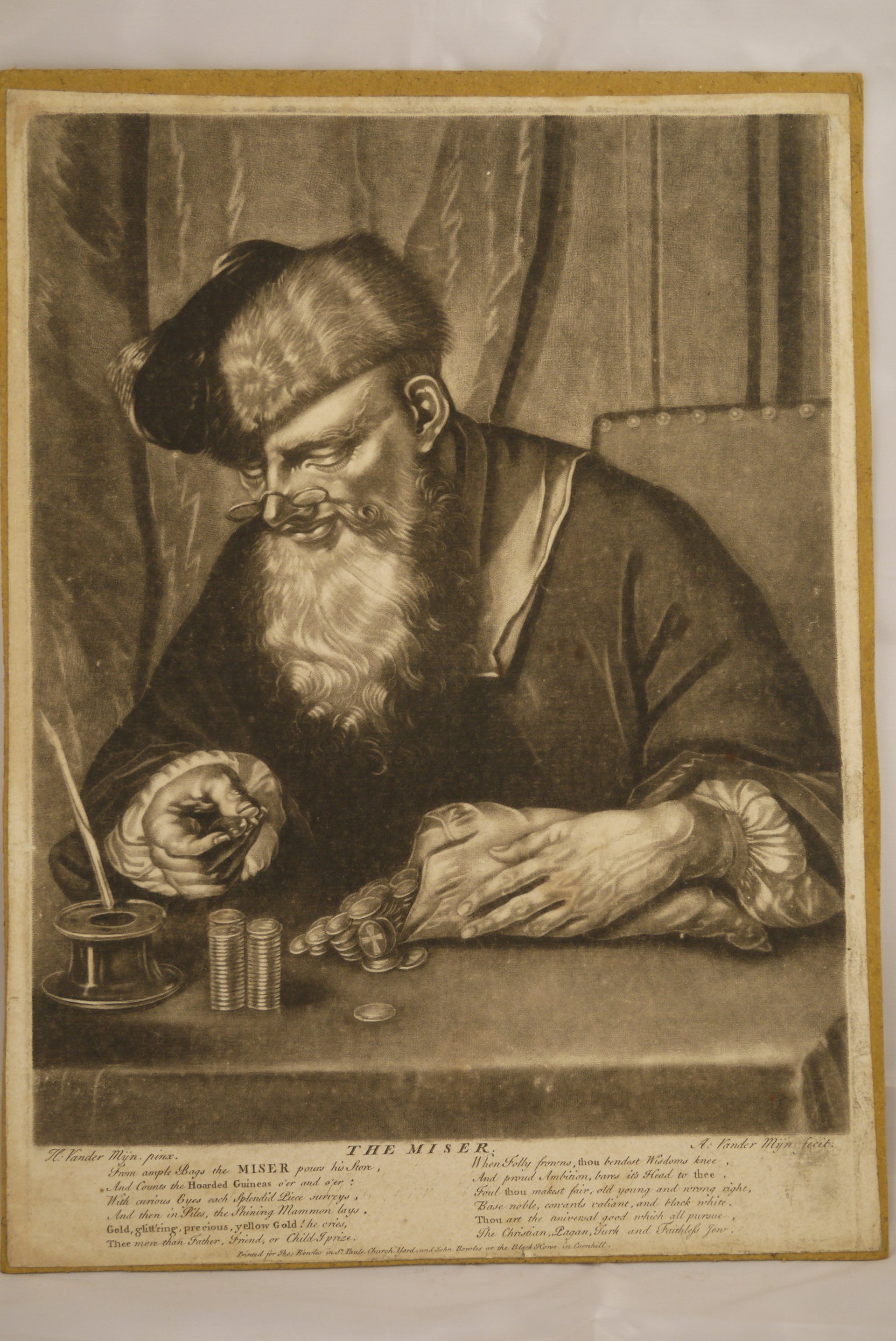 A bearded old man wearing spectacles and a fur hat, shown half-length seated to left at a table counting gold coins, with a bag under his left hand and an inkpot by the coins. Mezzotint print laid on card, made by Andreas Van der Myn (1714 - 1768), after Heroman van der Mijn (1684 - 1741), published by John Bowles (1701-1779) circa 1760s. Plate size: 35cm high x 25cm.
