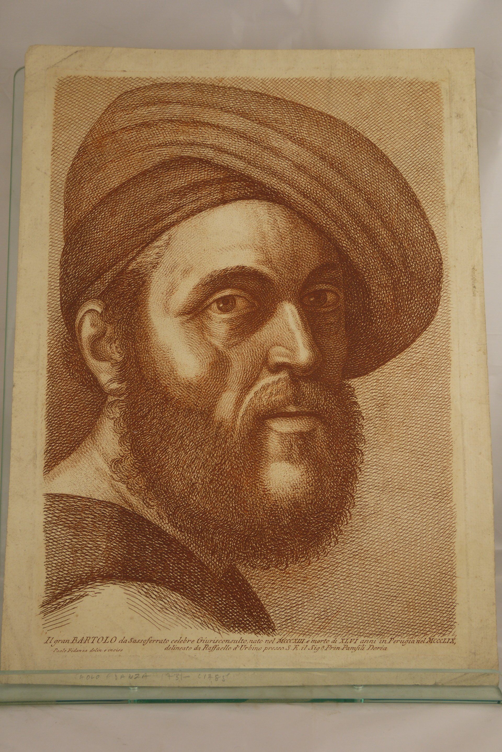An etching by Paolo Fidanza (1731 – 1785), of the head of Andrea Navagero (1483-1529), a detail from Raphael's 'Portrait of Andrea Navagero and Agostino Beazzano' (1516) now in the Galleria Doria Pamphili, Rome. Published in 'Recueil de têtes choisies de personnages illustres dans les lettres et dans les armes éxactement dessinées et gravées de la grandeur des originaux par Paul Fidanza', Rome 1785, 1. The painting - now universally accepted as Raphael's original - has long been regarded as a high quality copy of the original, formerly thought to have gone lost. The legend below image credits Raphael with the design of the composition, and identifies the sitter as the law professor Bartolo da Sassoferrato (1313-57). Plate size: 42.5cm high x 30cm.