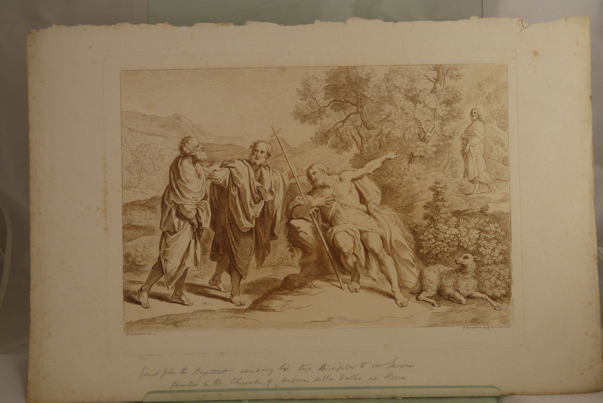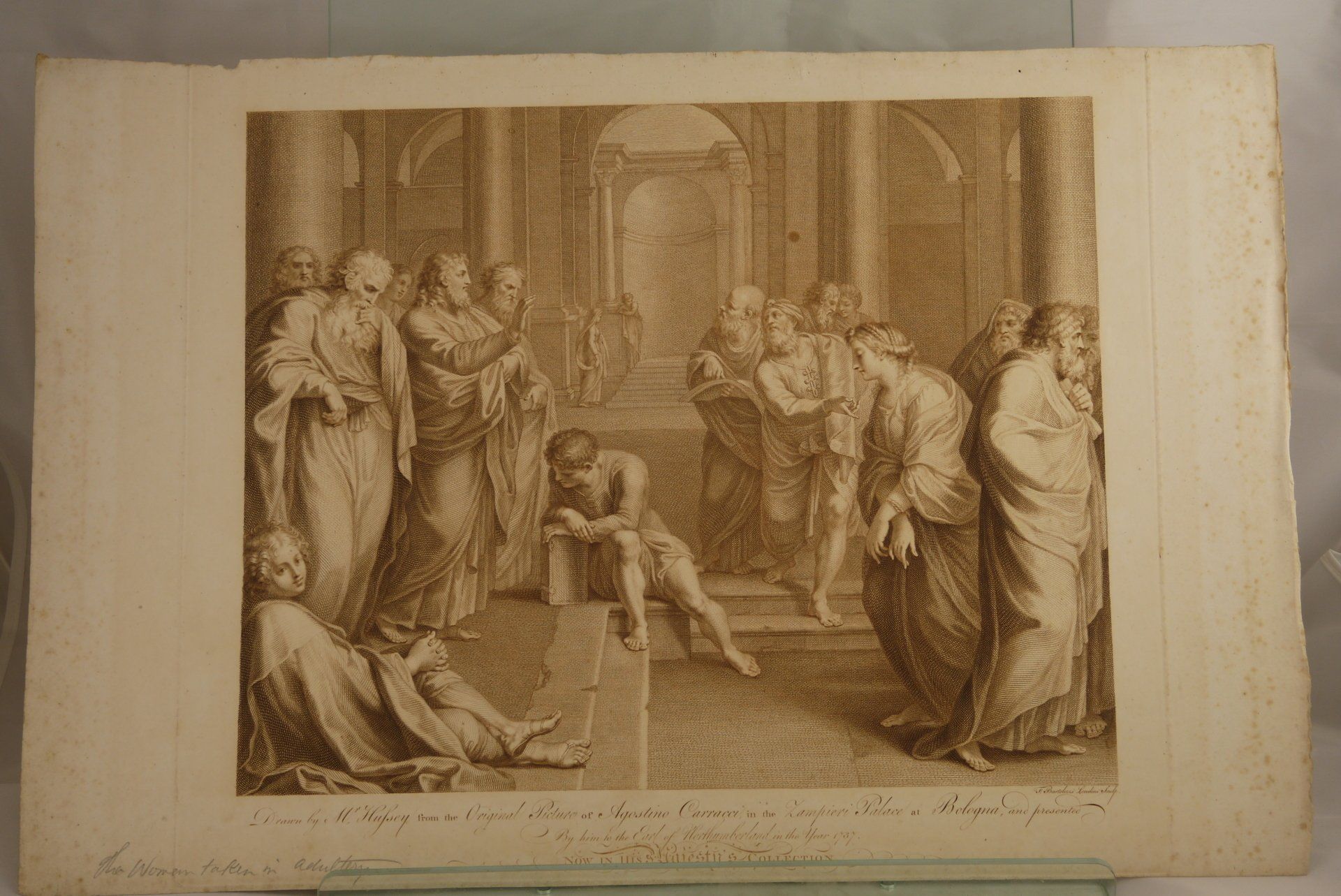 The Woman Taken in Adultery: Inscribed below image; Drawn by Mr Hufsey from the Original Picture of Agostino Carraci in the Zampieri Palace in Bologna and presented by him to the Earl of Northumberland in the year 1737. Now in His Majesty's Collection. Etched and engraved in brown ink; Print made by Francesco Bartolozzi (1727 – 1815), after Agostino Carracci, Published by John Boydell in 1764. Image size: 31cm high x 39cm.