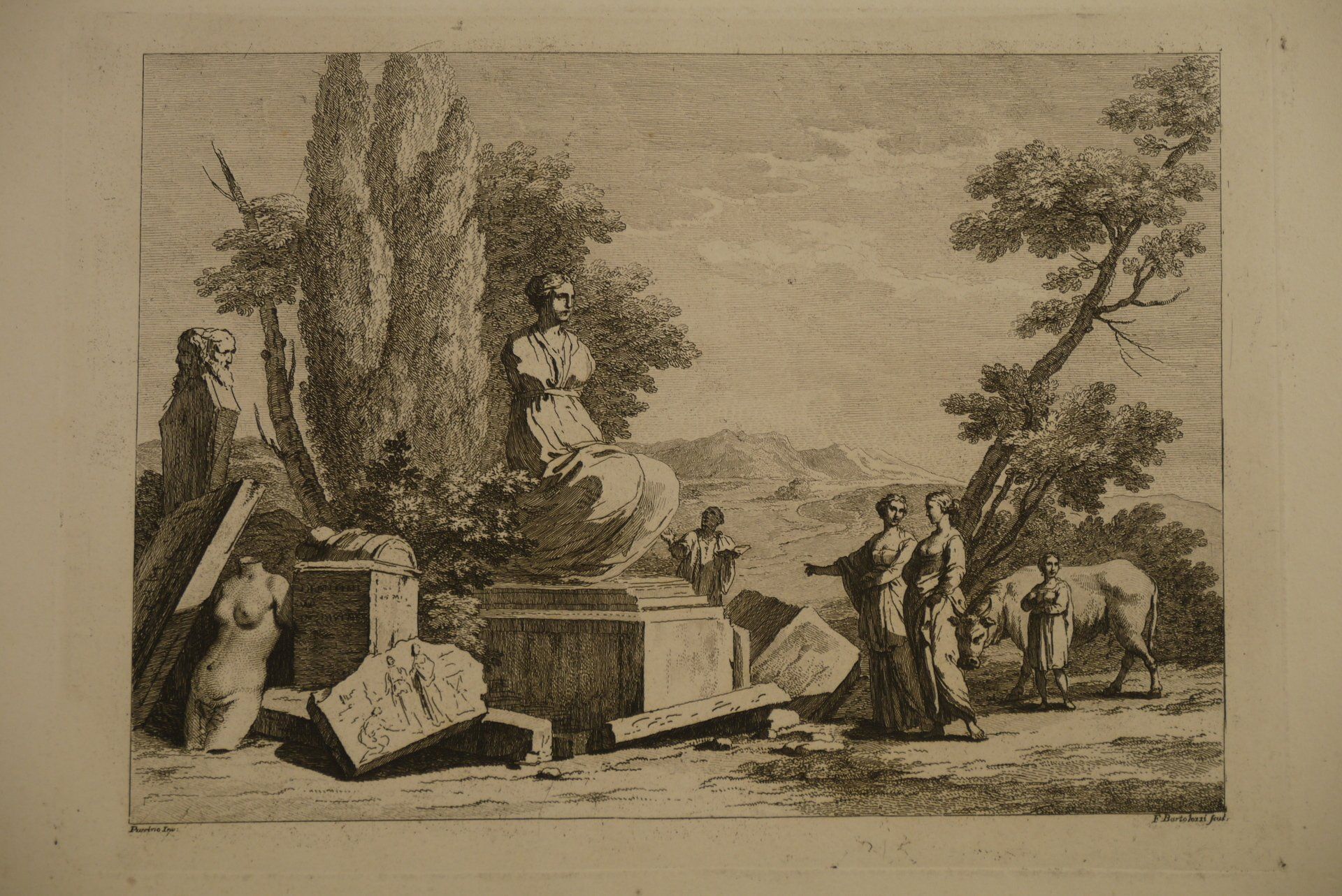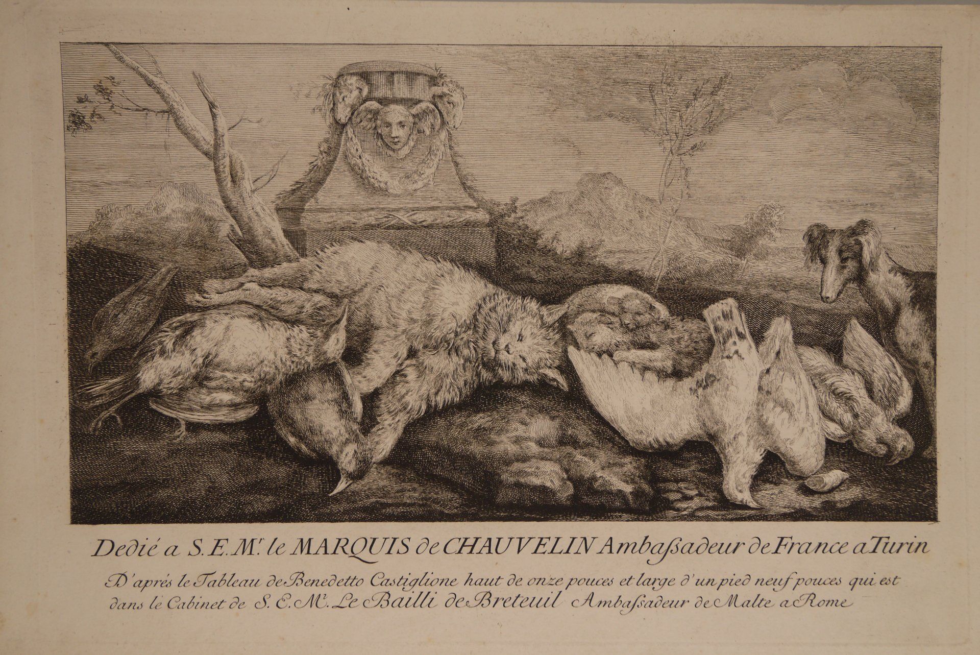 After Giovanni Benedetto Castiglione (1609 - 1664), Engraving, 18th century, inscribed (translation in brackets not on the print):- Dedie a S.E.M. le Marquis de Chauvelin Ambassadeur de France a Turin, (Dedicated to H.E. the Marquis de Chauvelin Ambassador of France to Turin); D’apres le Tableau de Benedetto Castiglione haut de onze pounces et large d’unpied neuf pounces qui est dans le Cabinet de S.E.M. le Bailli de Breteuil Ambassadeur de Mate a Rome, (According to the Benedetto Castiglione painting, eleven inches high and nine feet wide, which is in the Cabinet of H.E.M. the Bailli de Breteuil Ambassador of Malta to Rome). Plate size: 24.8cm high x 36.5cm.