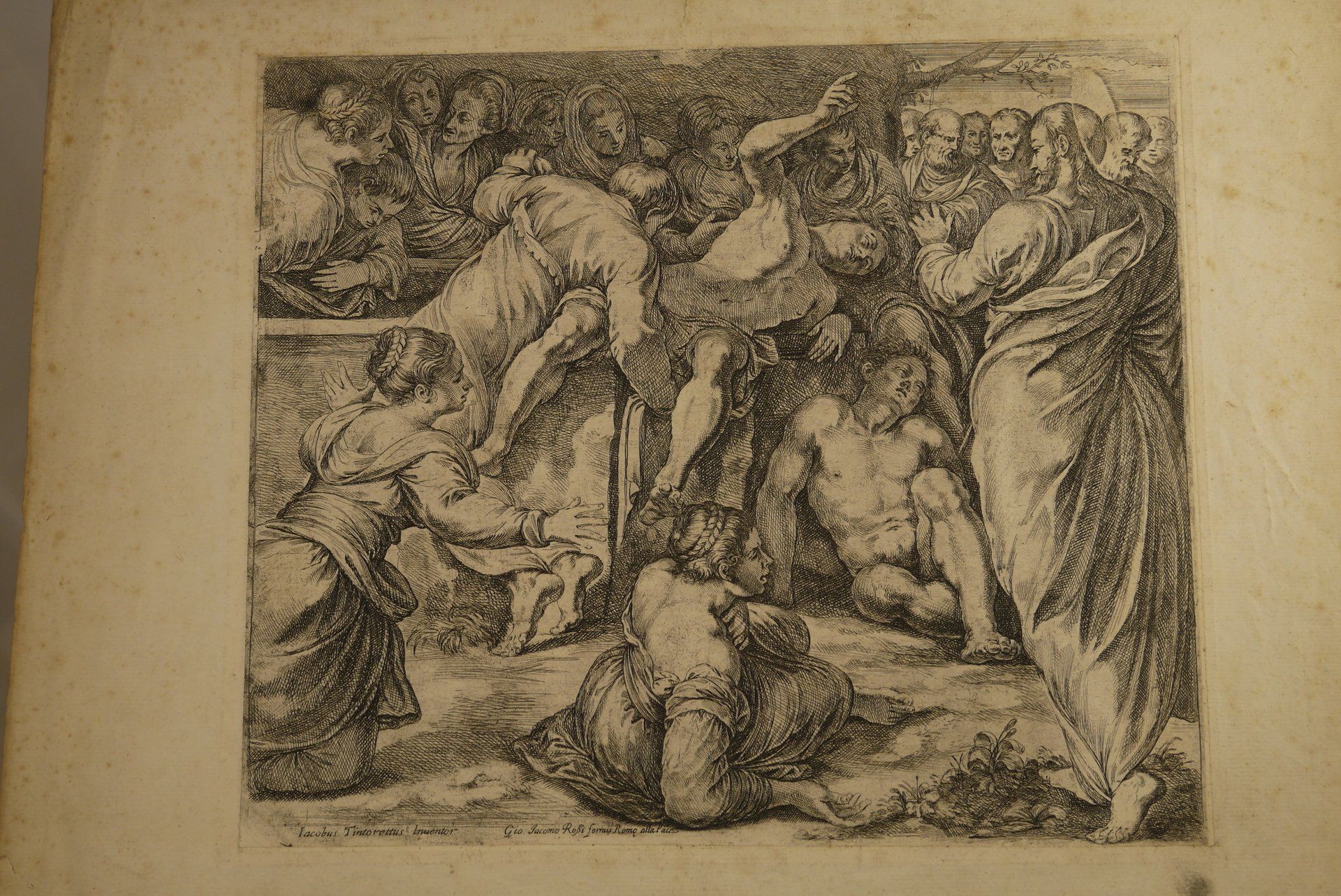 The Raising of Lazarus; Christ at the right blesses Lazarus who is pulled out the tomb, two women are in the foreground; a crowd of men and women are in the background; after Jacopo Tintoretto (1518 – 1594). Etching by Guglielmo Cortese (1628-1679), Published by: Giovanni Giacomo de' Rossi (1627-1691) in Rome circa 1650-1691. Lettered at bottom left 'Iacobus Tintorettus Inventor' and 'Gio. Iacomo Rossi formis Romae alla Pace'. Image size: 33cm high x 38.5cm.