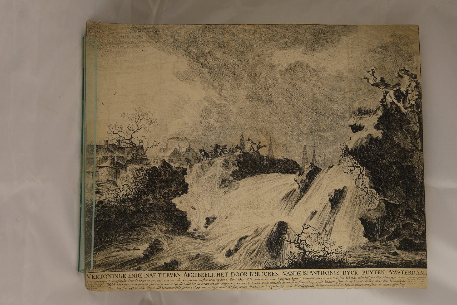 St. Anthony's Dike broke twice in the St. Peter’s flood of March 5, 1651 with the floods pouring through. Etching after Willem Schellincks (1627 - 1678). Engraved 1651, by Pieter Nolpe (1613/14 - 1652/53). Overall size: 51cm high x 40.5cm.
