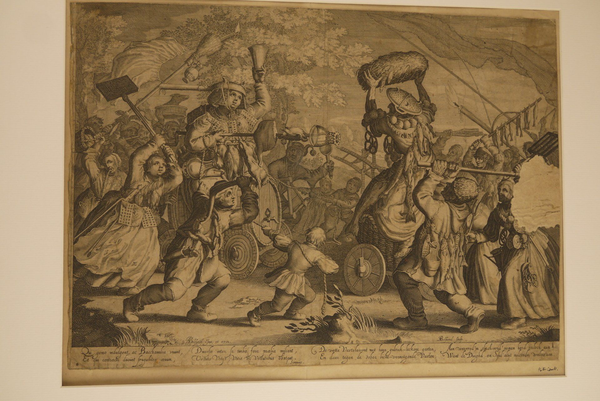 The Fight Between the Lean and Fat c.1610-1620; A carnival-esque battle between 'Fat' and 'Lean', a representation of the fight between gluttony (sin) and sobriety (virtue). Published by Boetius Adamsz Bolswert (c.1580-1633), engrave by his brother Schelte a Bolswert (1586–1659). The verses in Latin and Dutch along the bottom were written by Johannes Semmius and relate to the night of which the Carnival begins, the battlefield of the gluttonous and the sober, and how virtue and sin are always mutual enemies. The print here is in poor condition and has a piece missing from the right. Image size: 27cm high x 39.5cm.