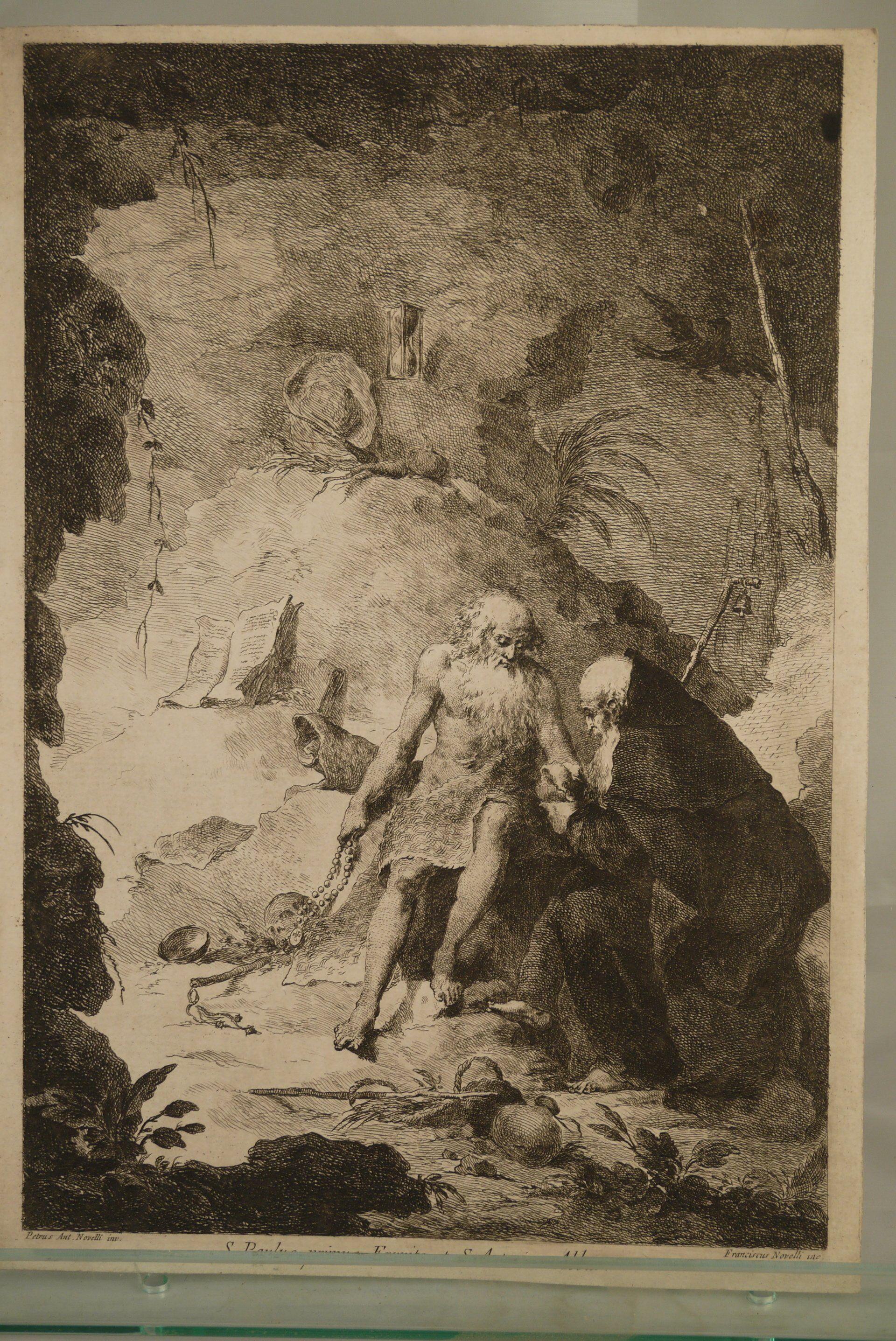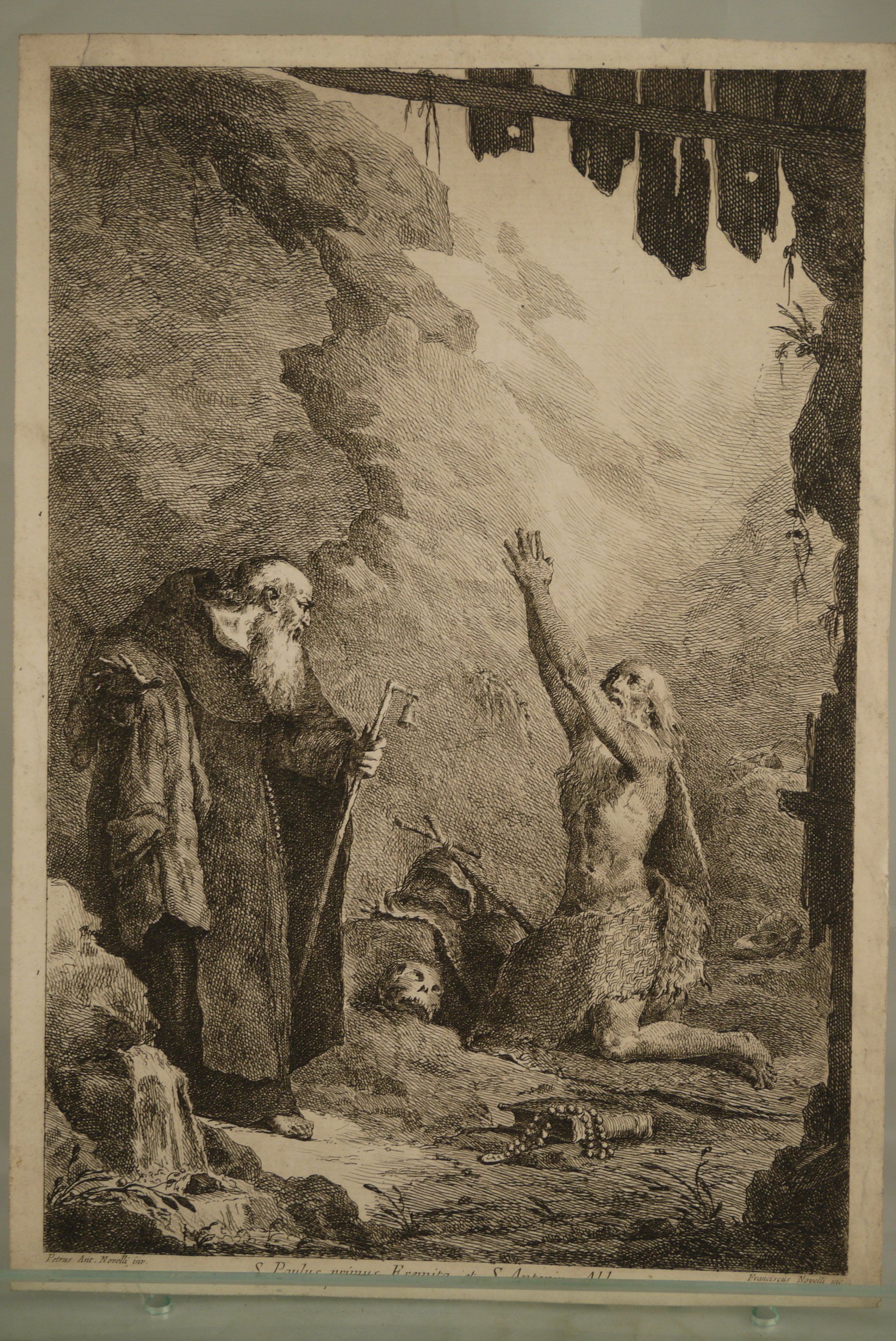 Saint Paul Primus Eremita et Saint Antonius Abbas: Saint Paul the Hermit kneeling and Saint Anthony Abbot conversing in a landscape, after Pietro Antonio Novelli (1729–1804), Produced by Francesco Novelli (1764–1836) circa. 1784–1836, Engraving image size: 30cm high x 20.5cm.