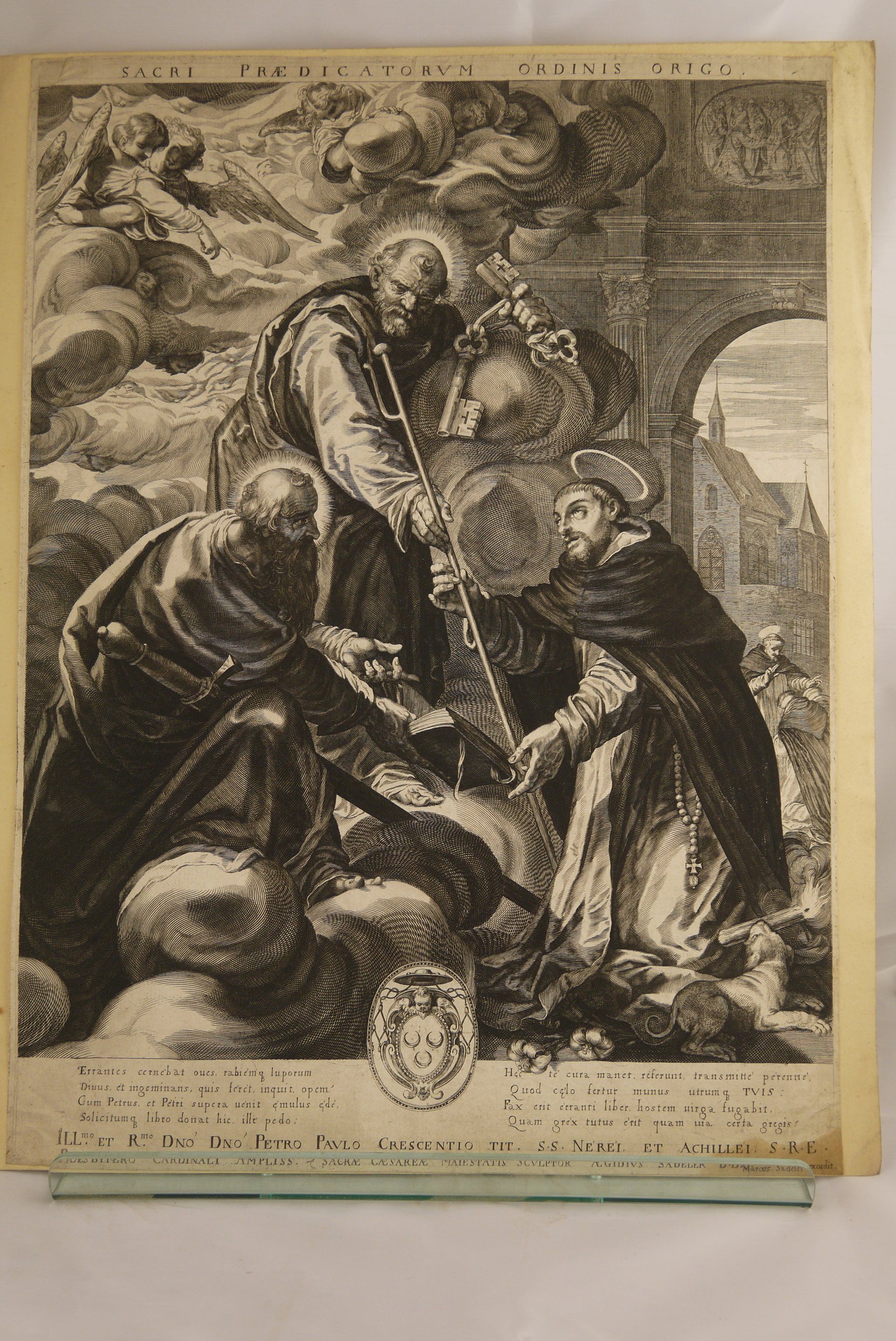 Dominic received from Peter and Paul to preach Sacri Praedicatorvm Ordinis Origo. St. Dominic kneels on the ground, before a gate, being visited by Peter and Paul who hand him a Bible and a walking stick and order St. Dominic to preach. Printmade by Aegidius Sadeler, circa, 1611 – 1629; after a painting by Joseph Heintz. Plate size: 53.5cm high x 39cm.