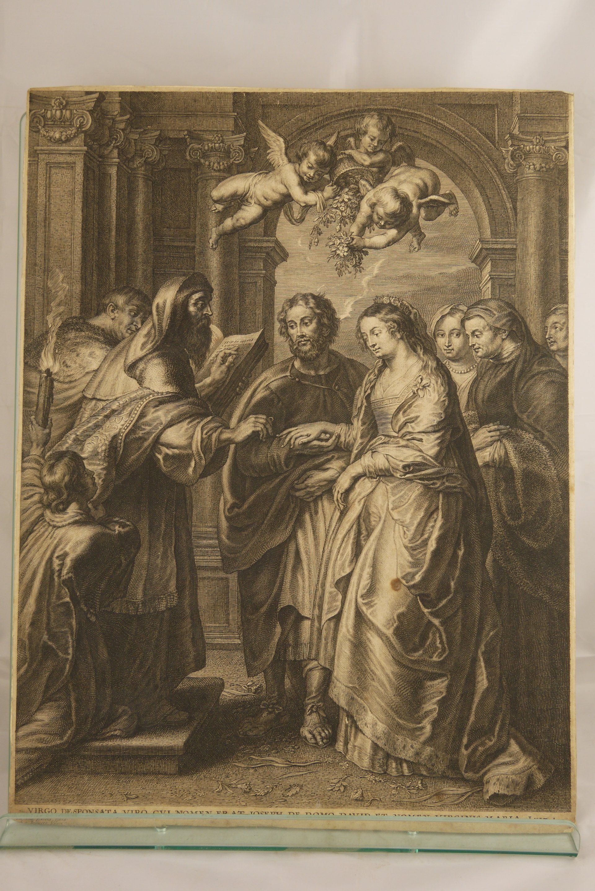 The wedding of the Virgin Mary and Joseph; interior of a classical building with the holy union of Mary and Joseph, a priest in the act of placing the marriage ring upon the finger of Mary, onlookers beyond, three putti holding flowers above the couple's heads; after Peter Paul Rubens. Engraving made by Schelte Adamsz. Bolswert (c. 1586-1659). Image size: 44.5cm high x 34cm.
