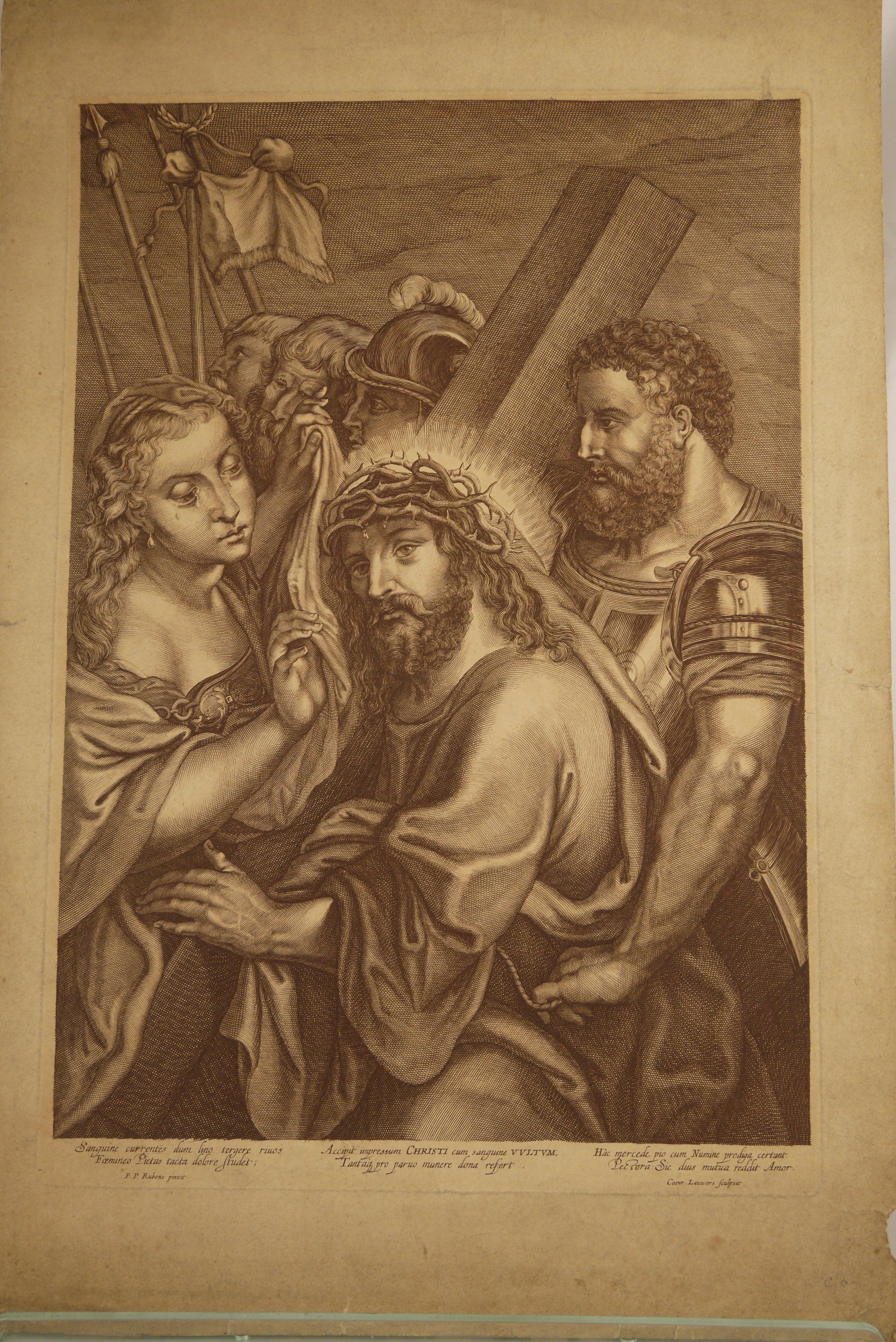 Christ carrying the cross; forced on by a soldier at right and three others in left background; St Veronica crying and holding the sudarium at left; group of six figures half-length; after Peter Paul Rubens. Engraving made by: Coenraad Lauwers. Production date 1645-1685. Plate size: 45.5cm high x 45.5cm high x 31.5cm.