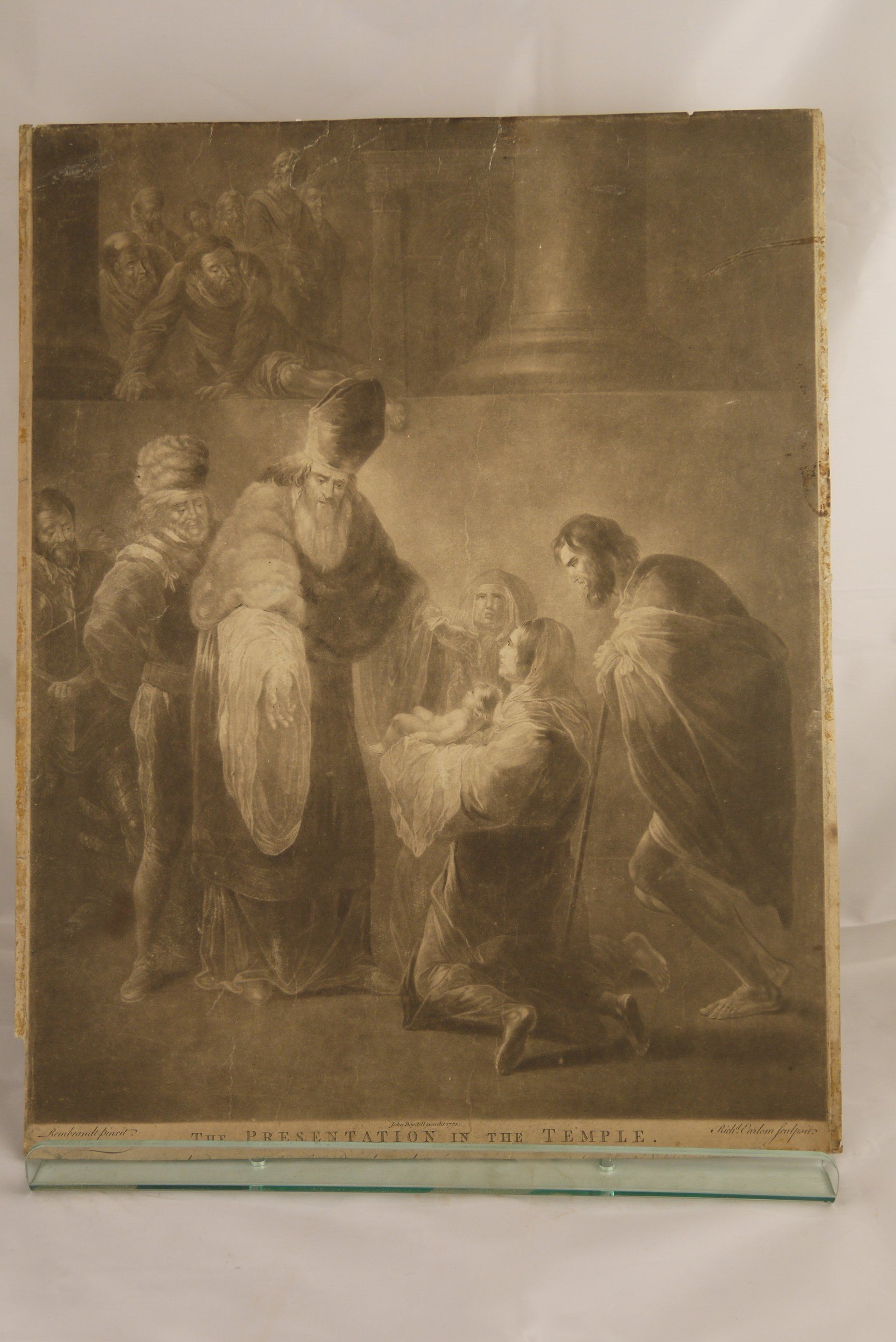 Mary kneeling and holding out the Christ child to the high priest, who leans down with open arms; a group of men looking on from a higher level between pillars, one climbing down; Joseph standing behind Mary in a humble attitude to right; after Rembrandt. Mezzotint with etching made by Richard Earlom, after Rembrandt, published by: John Boydell in 1771. Image size: 44.5cm high x 35.5cm.