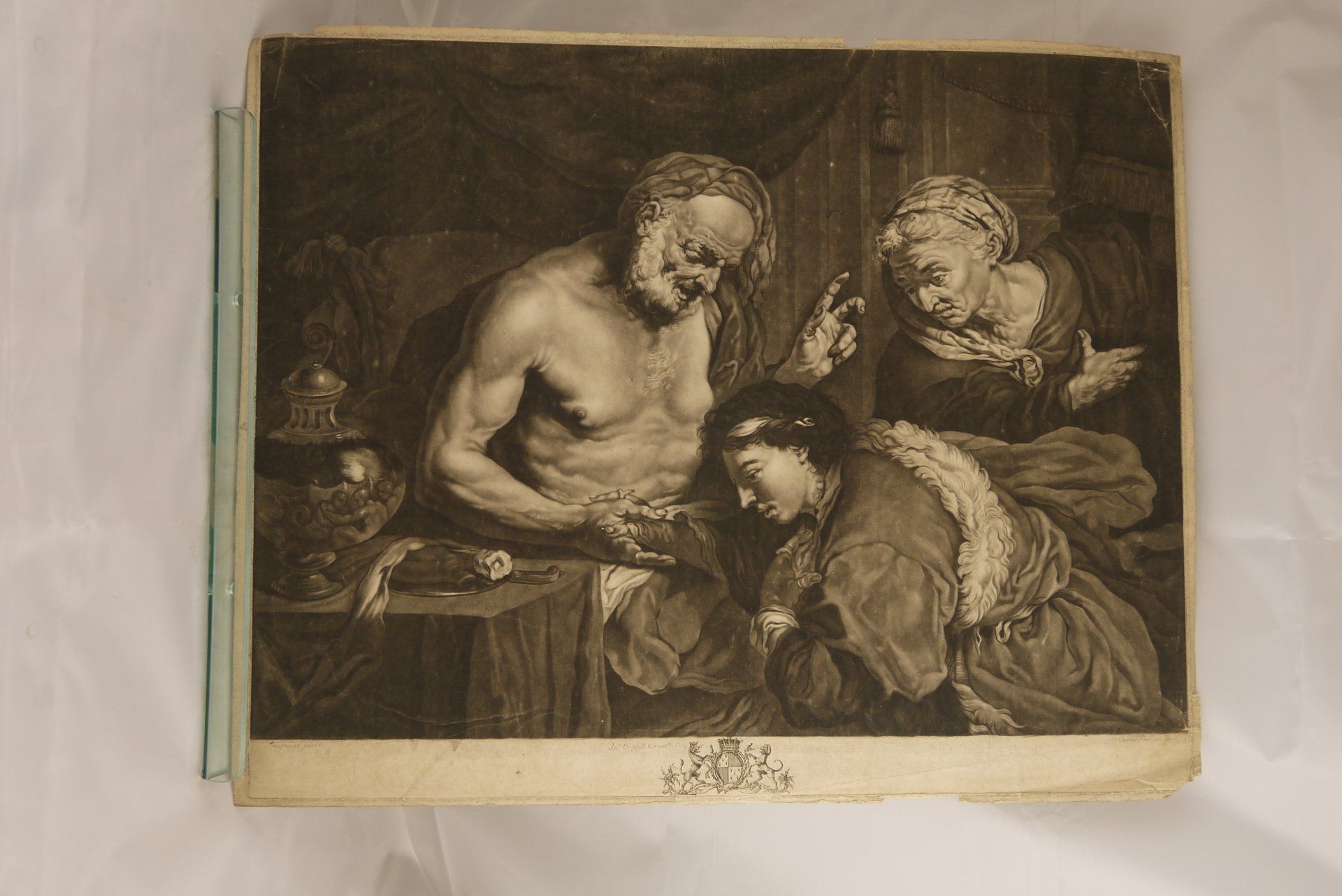 Isaac blessing Jacob (Genesis 27); a young shepherd boy bowing before an old man, who sits at a table on which is a decorated pot, plate and knife, and points upwards, taking the boy's hand, while an old woman looks on, leaning in from right; after Ribera; Mezzotint scratched letter proof. The second state describes the subject as Isaac blessing Jacob, and refers to the painting in the collection of the Earl of Chesterfield to whom the print is dedicated. The painting is not mentioned in the catalogue raisonné of Ribera's works by Nicola Spinosa; but the print is after a painting (with the composition in reverse) attributed to Giovanni Battista Langetti in the Art Gallery of Ontario, or one very similar to it. Print made by: Charles Phillips (fl. 1750s-1787) After: Giovanni Battista Langetti (1635-1676), Published by John Boydell (1719-1804) in 1767. Overall size: 51cm high x 41cm.