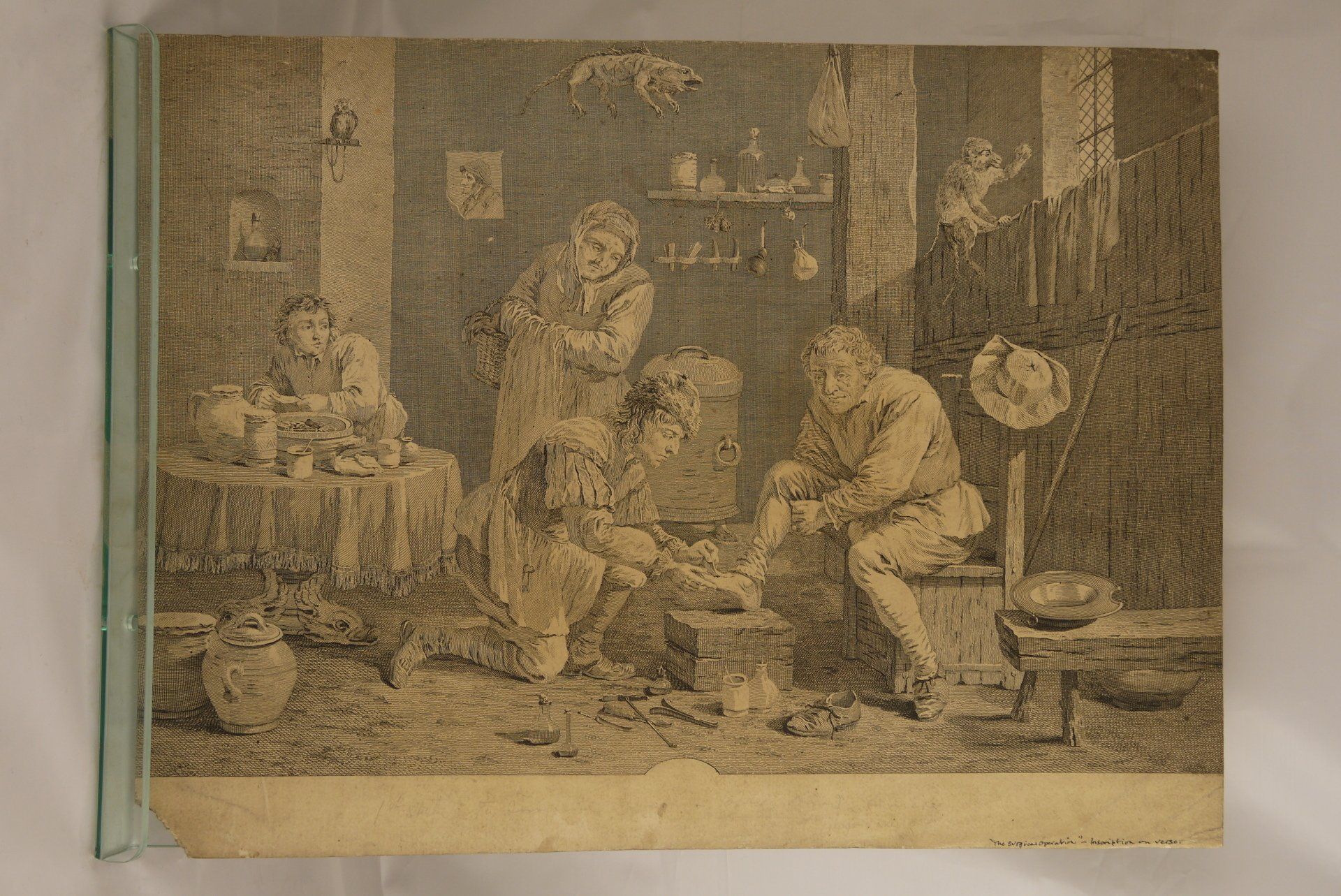 After David Teniers the Younger: A rural surgeon treating a male patient's foot, in the background an assistant is mixing a concoction with a pestle and mortar in a surgery. 1st state before lettering, Engraved by Thomas Major (1720-1799) in 1747. Image size: 31.8cm high x 47cm.