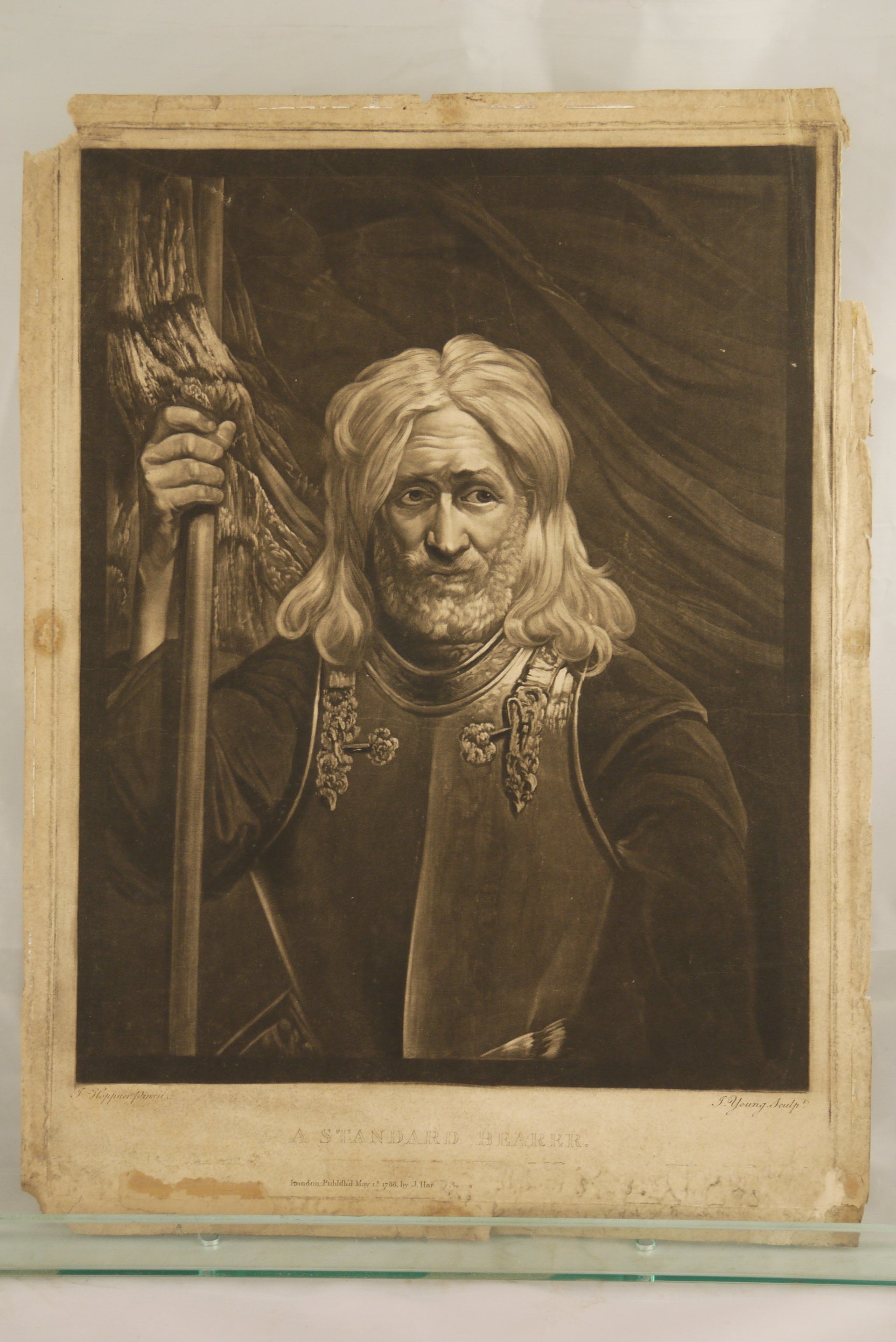 A Standard Bearer; A bearded man with chin-length hair, shown half-length facing front, wearing a breastplate, holding a standard in his right hand, glancing away to right. Mezzotint engraved by J. Young after J Hoppner, published by John Harris (c.1740-1811) in 1788. Poor condition, Plate size: 38cm high x 27.5cm.