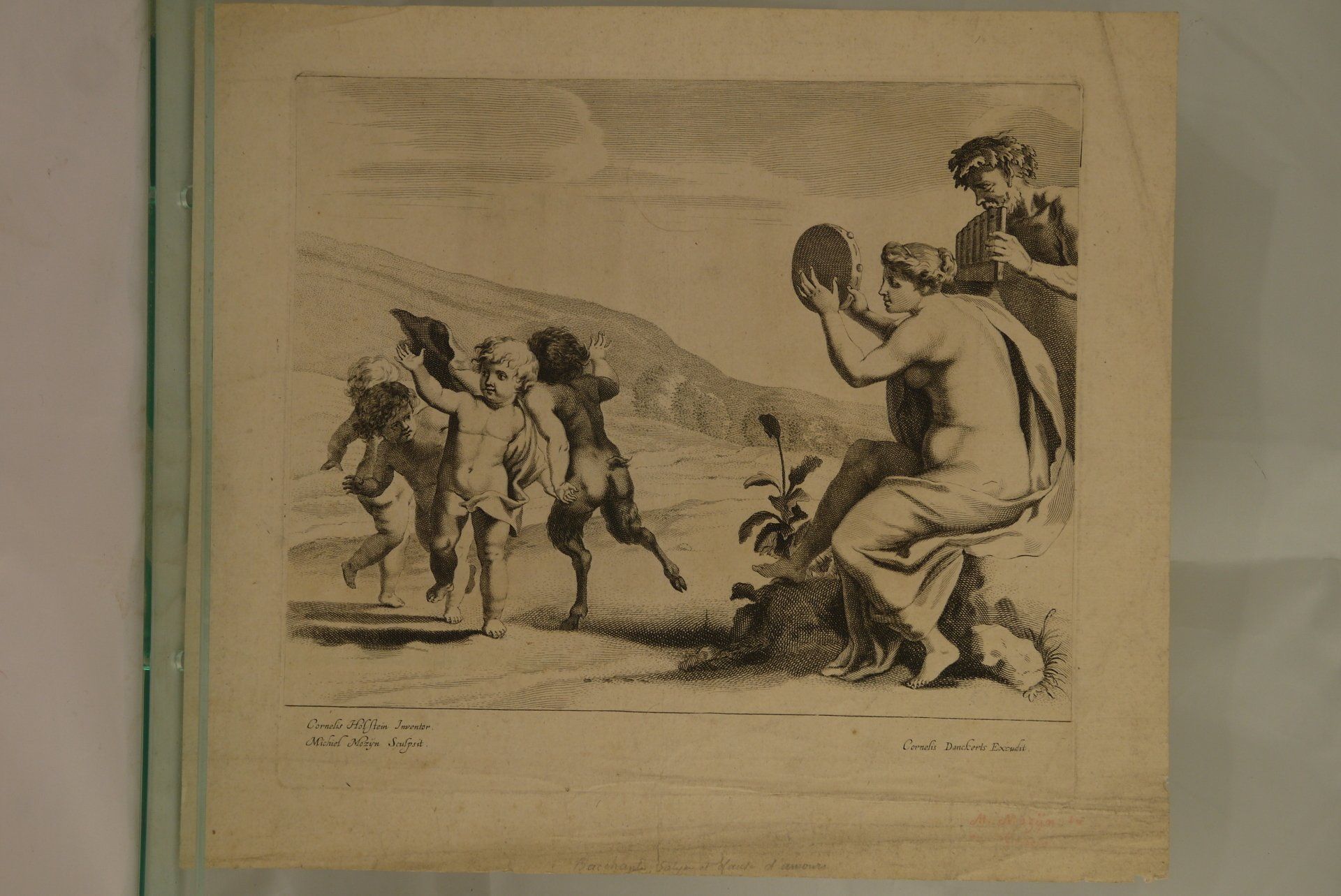Bacchanals and Satyrs Dancing to Love; Children satyr dancing with maenad children along to music played by a satyr (on the pan- flute) and accompanied by a maenad on the tambourine. A Maenad is a female follower of the Greek god of wine. Printmaker: Michiel Mosijn, designed by Cornelis Holstein, Published by Cornelis Danckerts (1603 – 1656). Plate size: 23.8cm high x 26.2cm.