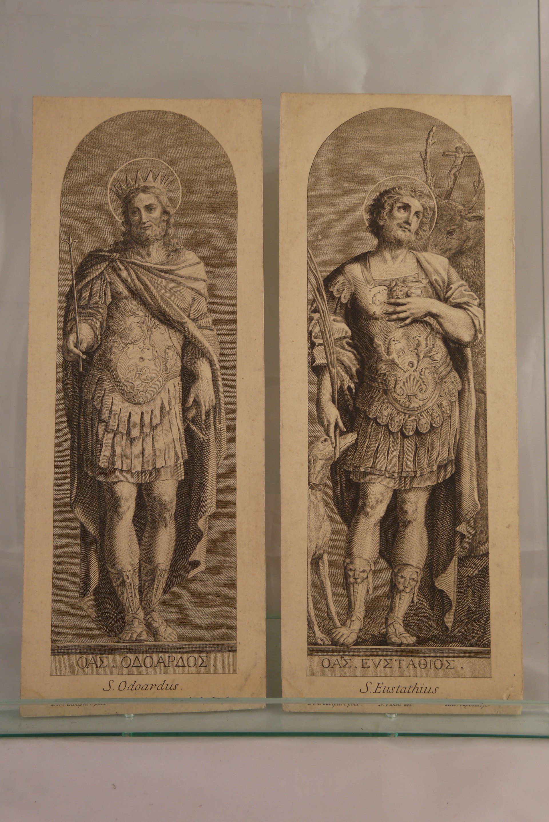 Copper plate engravings; 'S. Eustathius and S. Odoardus' - showing Saint Eustachius/Eustace and Saint Odoardus. After one of the frescoes Domenico Zampieri (1581 –1641) painted for the Abbey of Grottaferrata (near Rome). Engraved by Antonio Capellan (circa 1740 – 1793) Published by N. Vanni in 1762. Overall size of each print: 37cm high x 14cm.