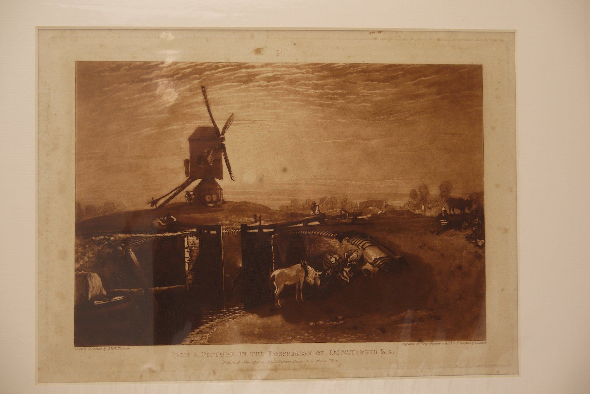 Windmill and Lock taken from turners painting Grand Junction Canal at Southall Mill. J.W.M. Turner Liber Studiorum: Mezzotint and etching with aquatint, published 1811, inscribed; From a Picture in the Possession of I.M.W.Turner R.A. ; Drawn and etched by Joseph Mallord William Turner; Engraved by Charles Turner. Plate size: 21cm high x 29cm.