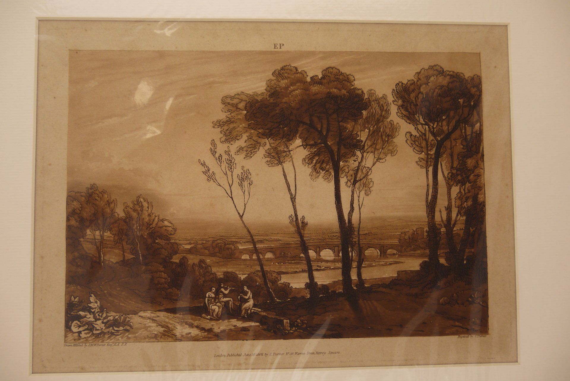 J.W.M. Turner Liber Studiorum: A classical landscape with a river and a bridge with eight arches in the middle distance; in the foreground, several trees and three classical figures, one playing a pipe. Mezzotint and etching with aquatint, published 1808; Drawn and etched by Joseph Mallord William Turner; Engraved by Charles Turner. Plate size: 21cm high x 29cm.
