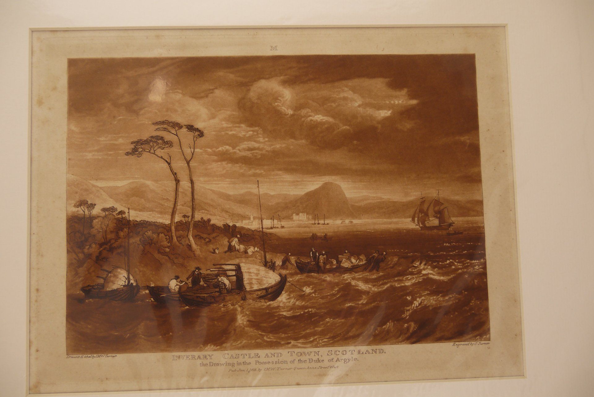 J.W.M. Turner Liber Studiorum: Mezzotint and etching with aquatint, published 1816, inscribed, Inverary Castle and Town Scotland. Drawing in the possession of the Duke of Argyle. Description: Loch Fyne breaking against the shor, with two stunted pines and several figures and boats, one being dragged off the shore; in the distance on the right, a tall ship; the far shore is lined by mountains and Inverary Castle and town. Drawn and etched by Joseph Mallord William Turner; Engraved by Charles Turner. Plate size: 21cm high x 29cm.