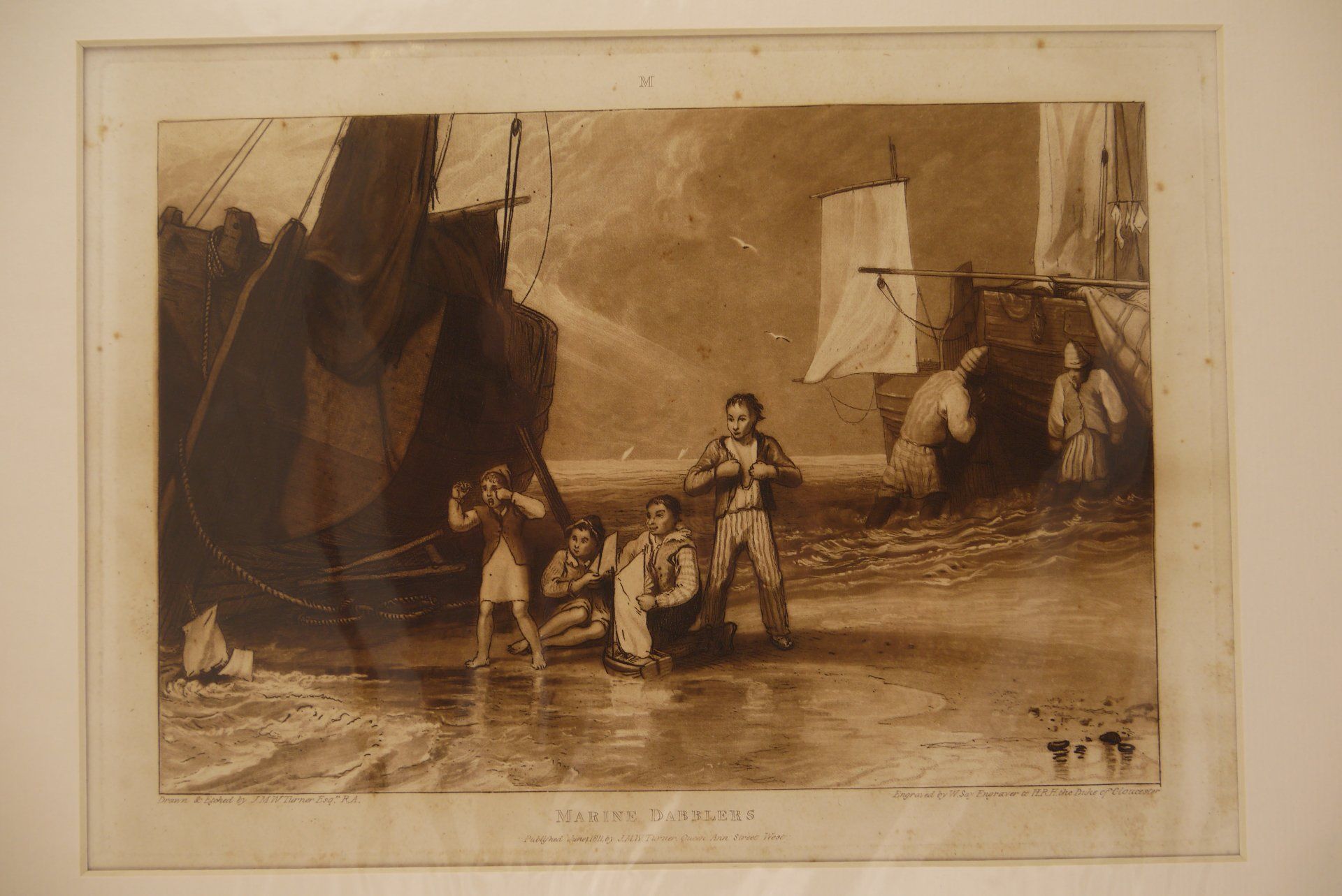 J.W.M. Turner Liber Studiorum: Four boys playing on the sea-shore sailing toy-boats; behind them three boats, one drawn up on shore to the left, another being pushed up on shore to the right. Mezzotint and etching with aquatint, published 1811, Drawn and etched by Joseph Mallord William Turner; Engraved by William Say. Plate size: 21cm high x 29cm.