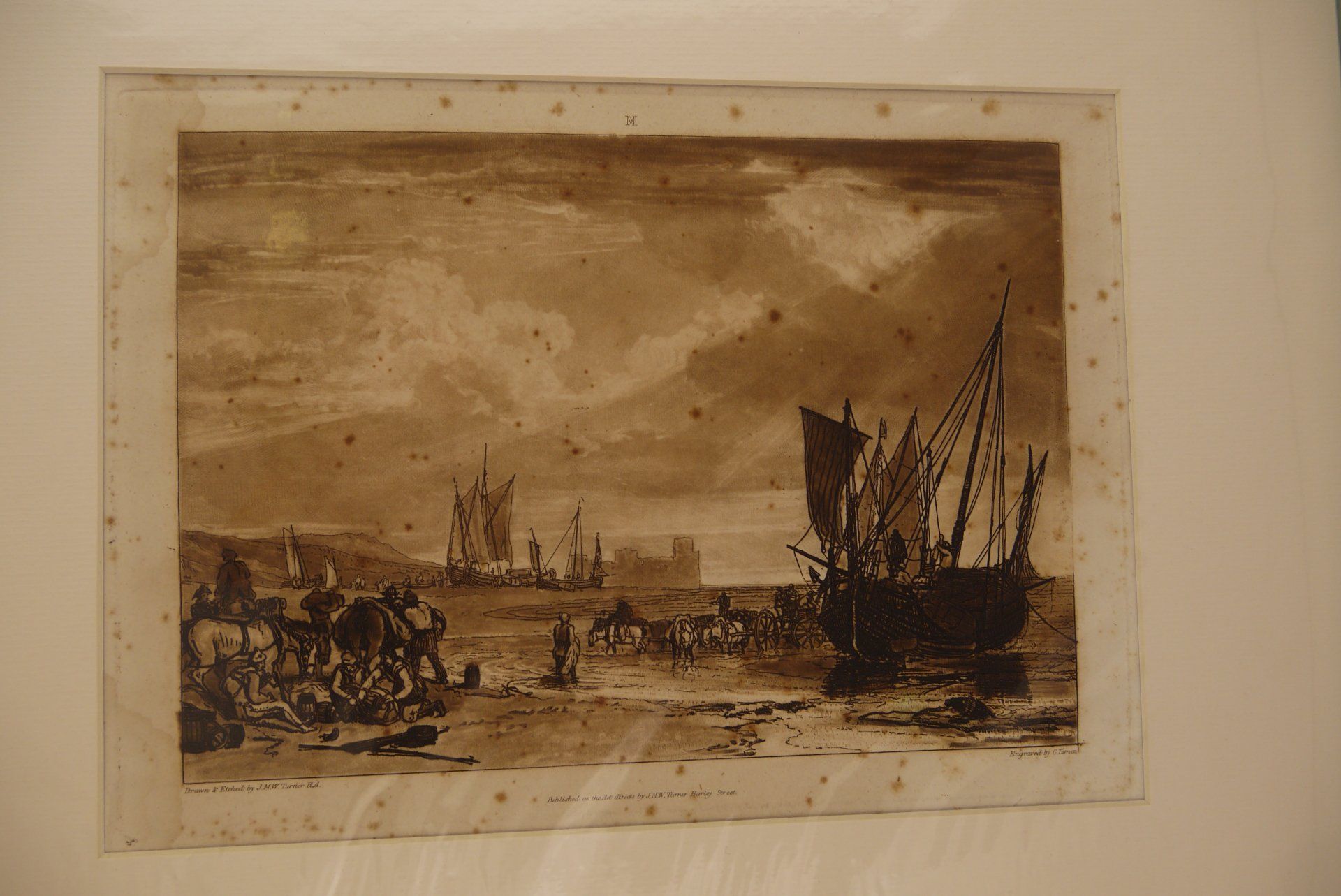 J.W.M. Turner Liber Studiorum: The seashore; a vessel unloading barrels onto carts drawn by horses on the right; men loading pack-horses on the beach on the left; a castle and two other vessels in the distance. Mezzotint and etching, foxed; Drawn and etched by Joseph Mallord William Turner; Engraved by Charles Turner in 1807. Plate size: 21cm high x 29cm.